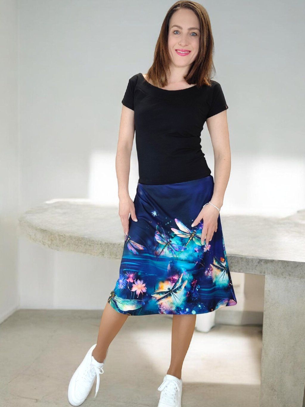 Áčková sukně DIEM v tmavě modré barvě s vážkami v sobě nese jemnou eleganci a lehkost. Motiv vážek působí vzdušně a dodává sukni nenápadnou originalitu.