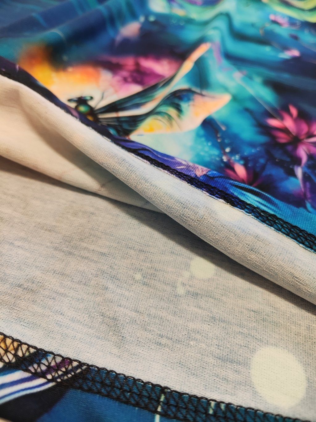 Tmavě modrá barva připomíná večerní oblohu, zatímco motiv vážek dodává lehkost a jemnou hravost. Celek působí klidně, elegantně a velmi žensky.