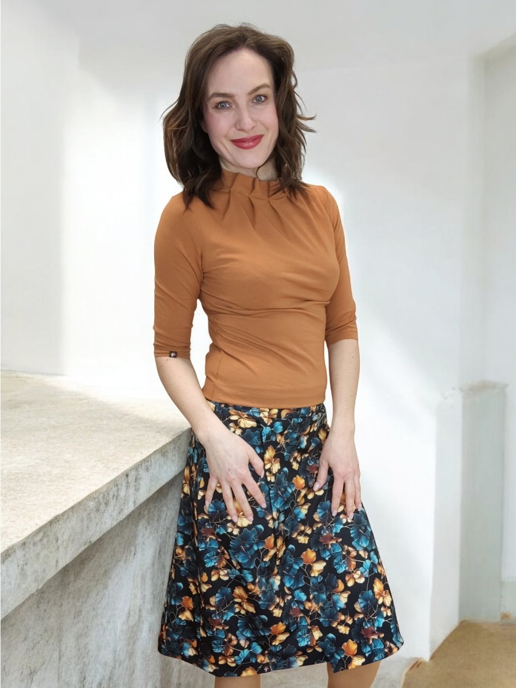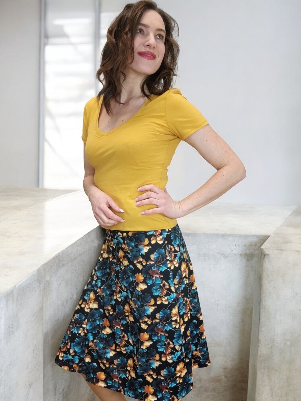 Sukně ENOLA tě vtáhne do symfonie tyrkysovo‑zlatého jinanu, kde každý lístek vypráví příběh podzimu. Áčkový střih jemně rozehrává siluetu a vytváří půvabný, elegantní dojem. Na předním díle má sukně decentní překryv, který dodává dynamiku a lehkost pohybu. Díky tomu, že se nosí na bocích, obepíná postavu přirozeně a přitom neztrácí volnost pohybu. Volba délek od 49 cm do 70 cm ti umožní najít ideální variantu – od hravě nad kolena až po elegantní midi. Tyrkysové tóny s dotekem zlatých listů jinanu vytváří kombinaci, která působí jako malý umělecký obraz. Tento vzor hezky ladí s jemnými svetříky, hladkými svetry i s doplňky v teplých barevných odstínech. Sukni ENOLA šijeme s láskou a precizností v českém ateliéru, kde se každému kusu dostává péče od prvního střihu až po poslední steh.