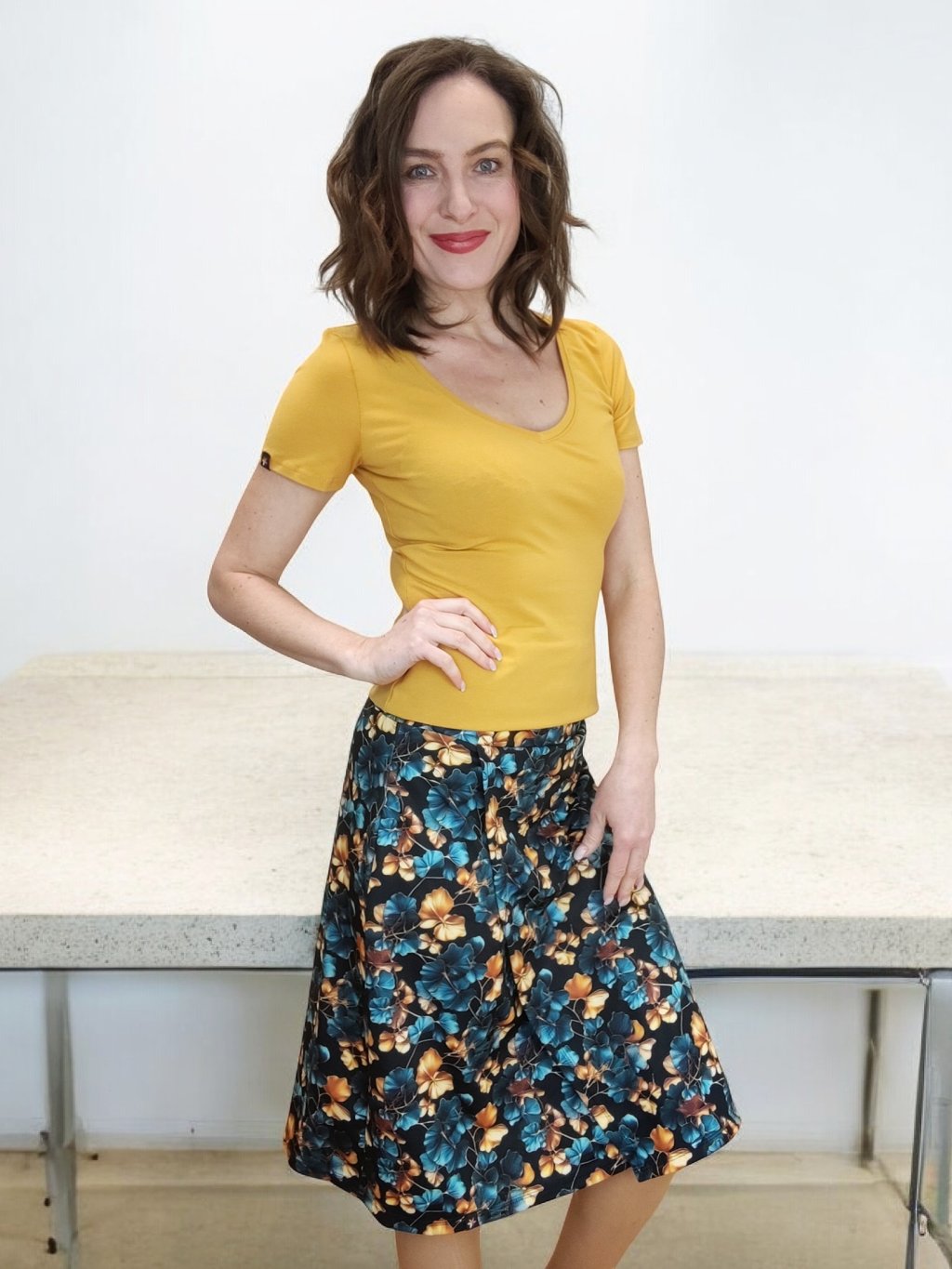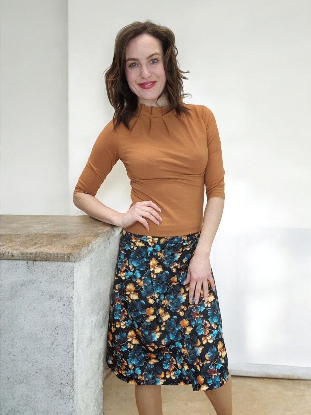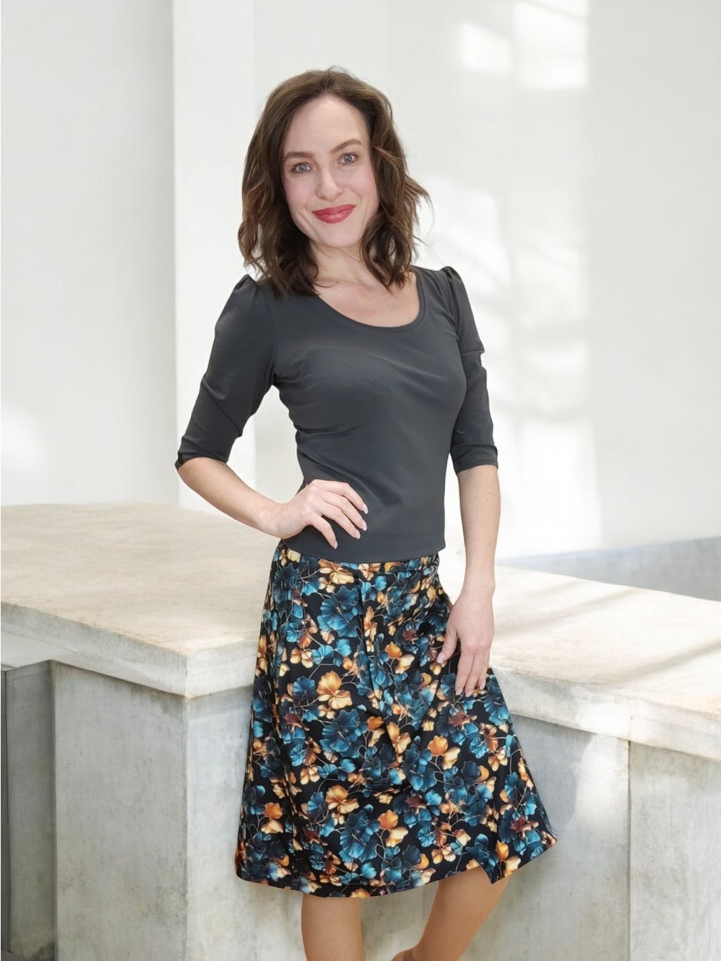 (Vychází z naše střihu LINDA) Sukně ENOLA má na předním díle elegantní překryv.