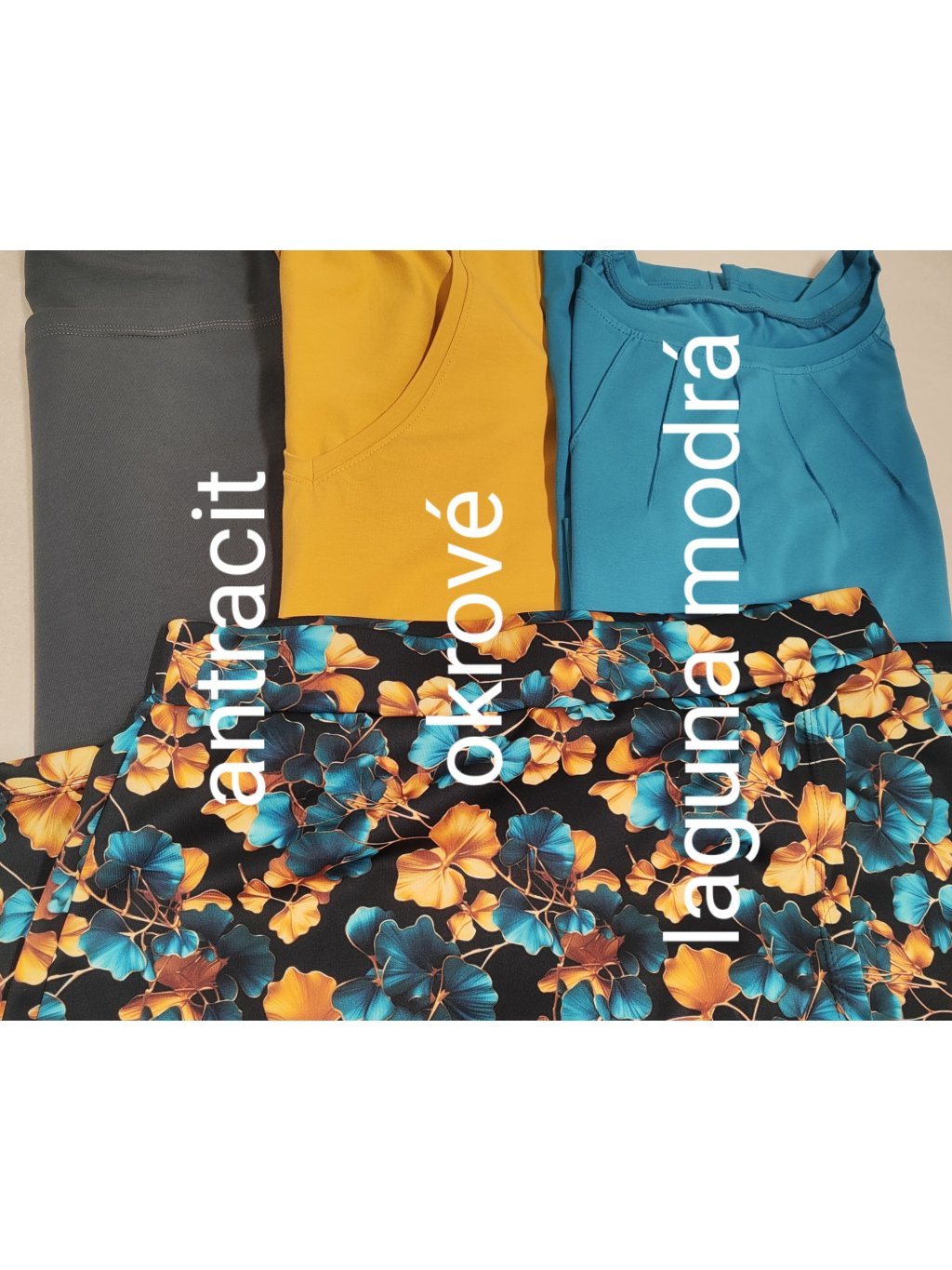 Vzorem tyrkysovo‑zlatého jinanu se prolínají tóny hlubokého tyrkysu a teplé zlaté, jako když podzimní světlo hladí padlé listy. Tyrkysová barva evokuje klidné jezerní hladiny, zatímco zlaté lístky jinanu připomínají zlatavý opar listí. Společně tvoří harmonii, která působí noblesně i hravě zároveň a dodává outfitu jedinečný charakter.