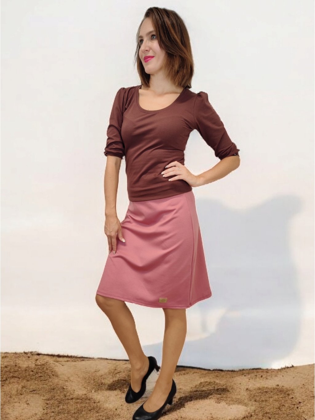 Tato áčková sukně LINDA v jemné starorůžové barvě kombinuje romantiku a praktičnost. Má pohodlný pružný pas s 4 cm širokou gumou a lichotivý střih, který krásně sedí a nechá vyniknout vaši siluetu. Lehký, vzdušný materiál se příjemně nosí a sukně se snadno kombinuje s různými topy i doplňky.
