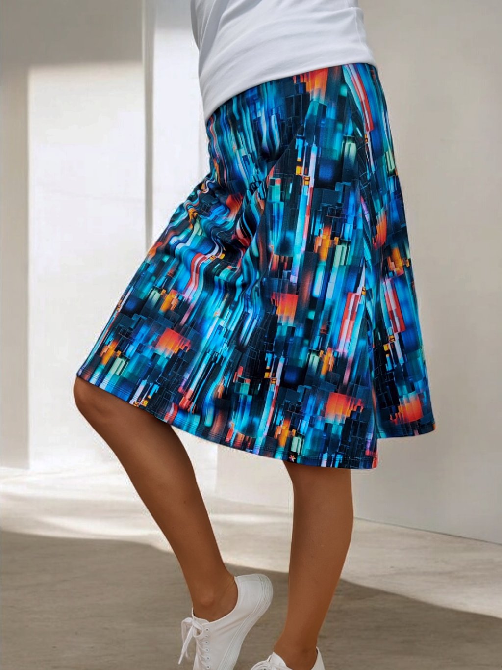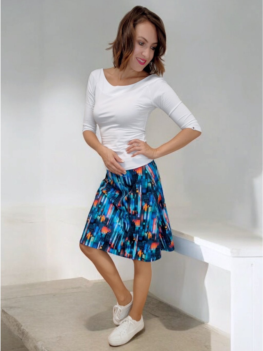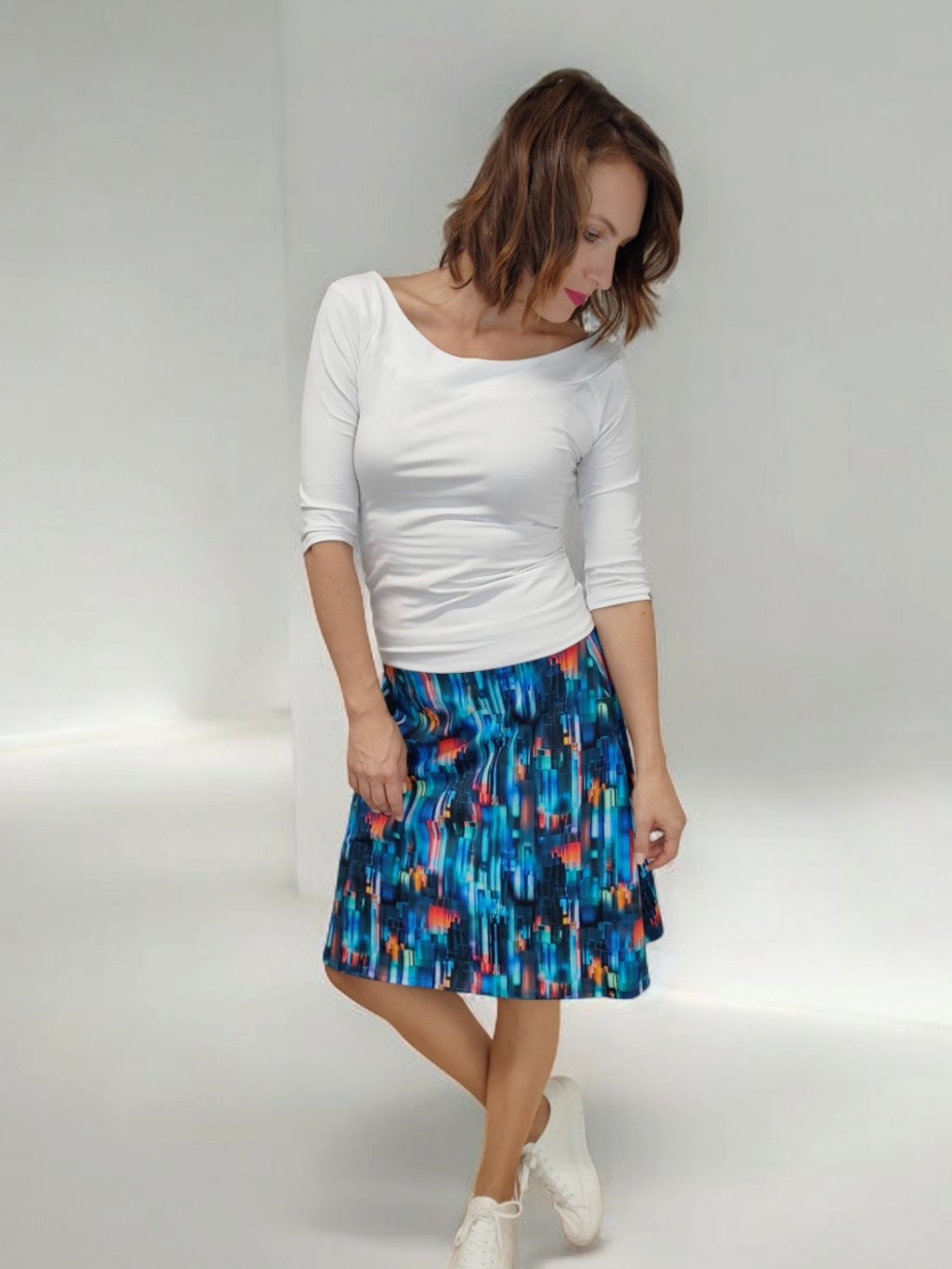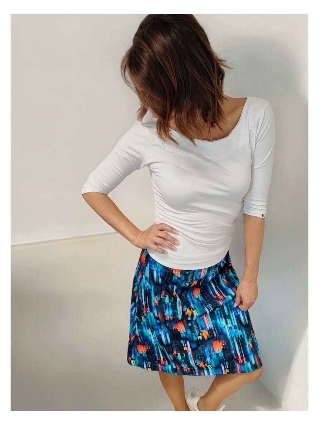 Sukně se nosí na bocích. Pokud si přejete áčkovou sukni do pasu, tak zvolte střih VERENA.