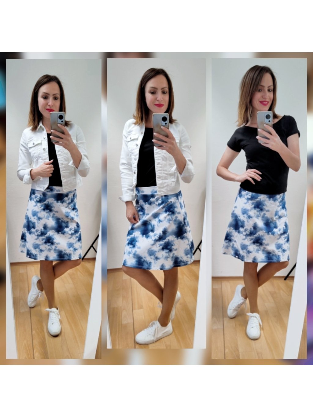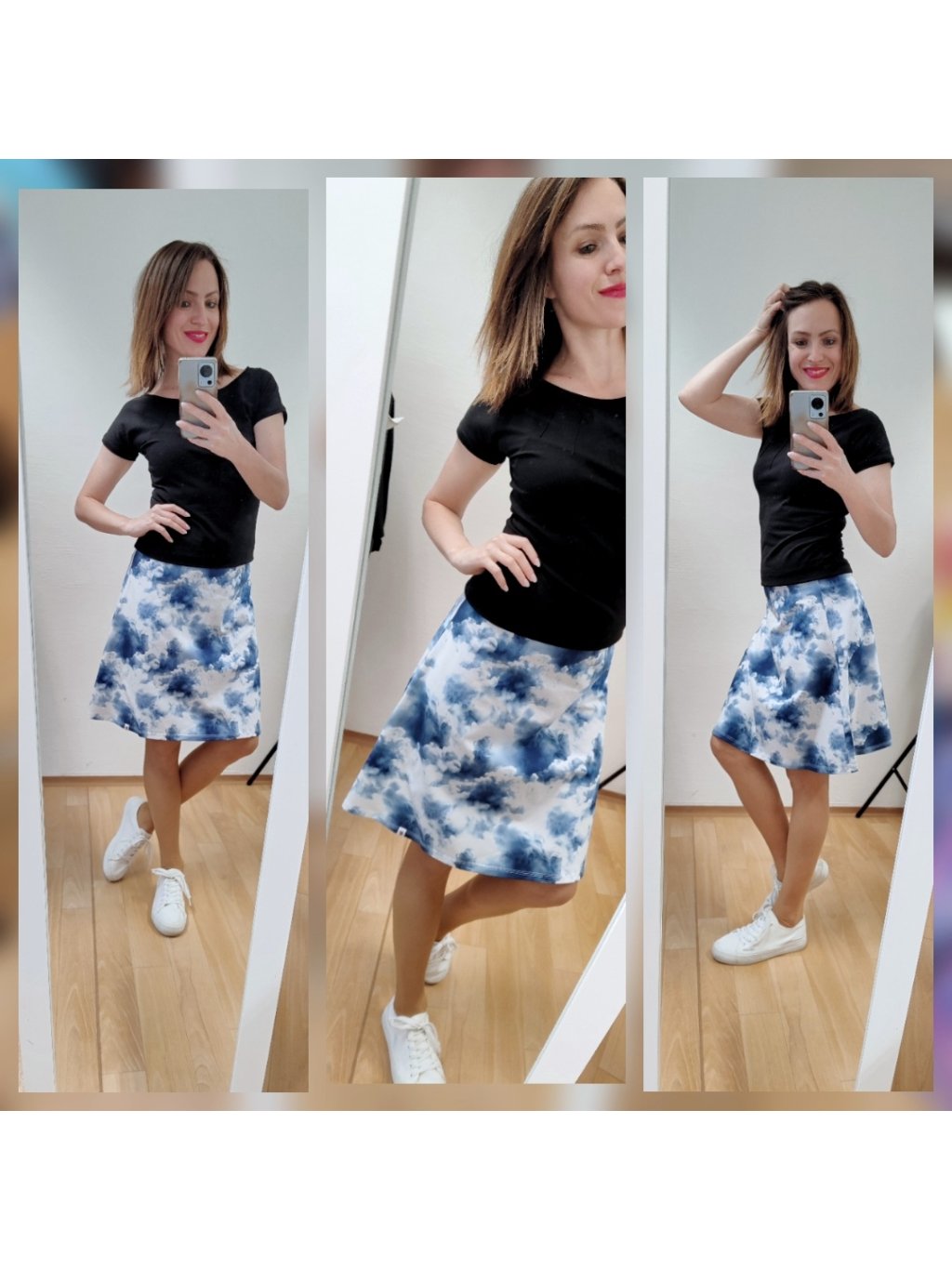 Sukně střihu PERRY je více rozšířená, než sukně LINDA a zároveň to není úplně půlkolový střih. Zkrátka něco ,, mezi " co nám v nabídce chybělo.