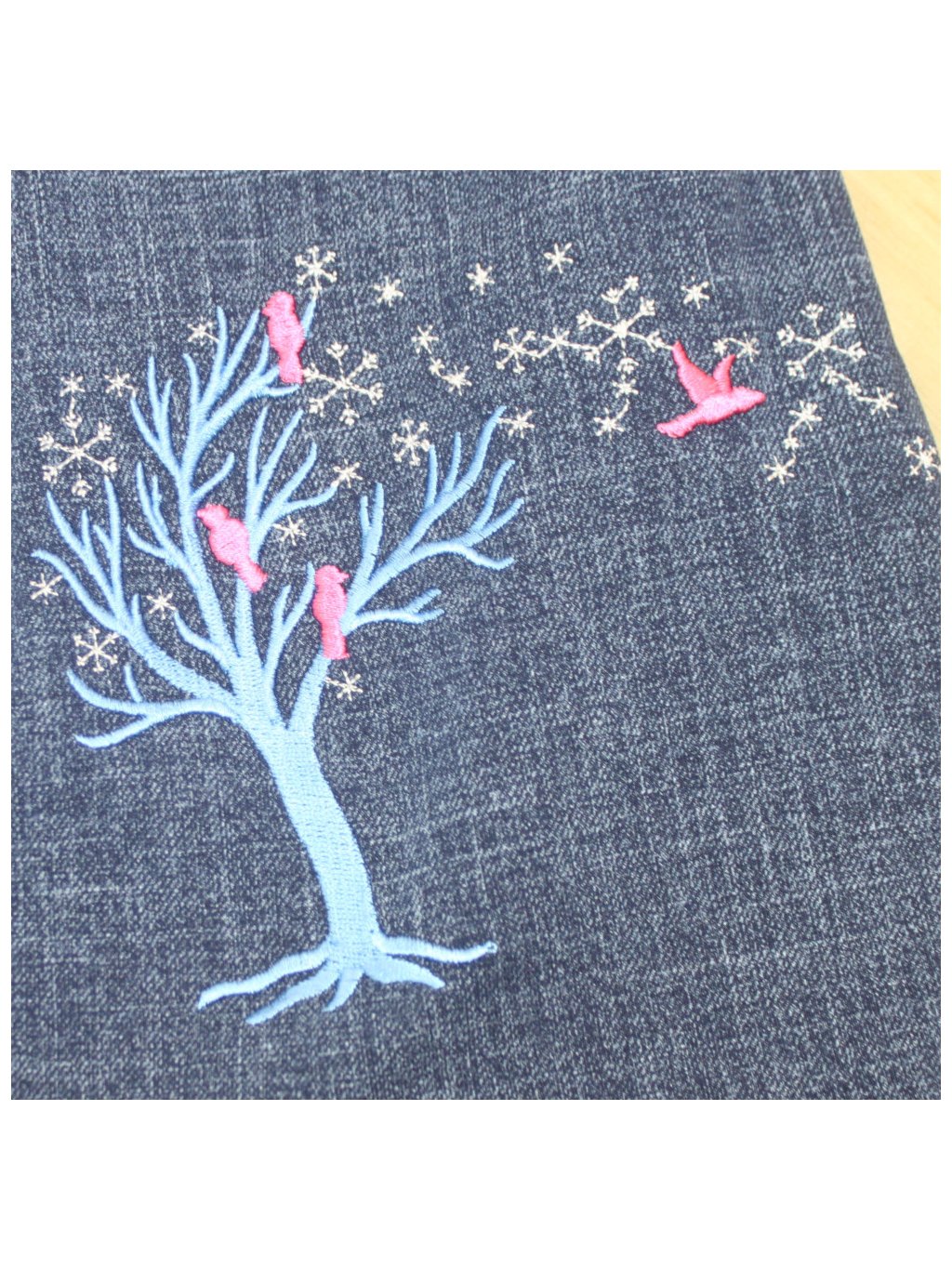 Áčková sukně, sklady, delší zadní díl, vzhled džínoviny, strom sníh a ptáčci