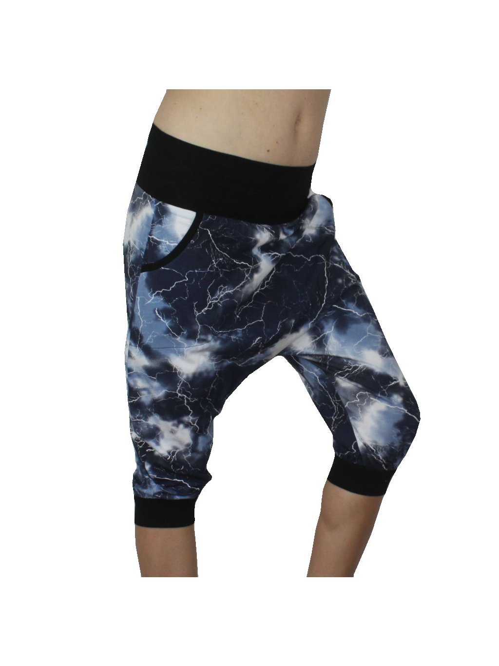 Kalhoty mají snížený rozkrok, jsou volné a rozkrok je až cca v půlce stehen. V bocích kají kalhoty kapsy s lemem. |