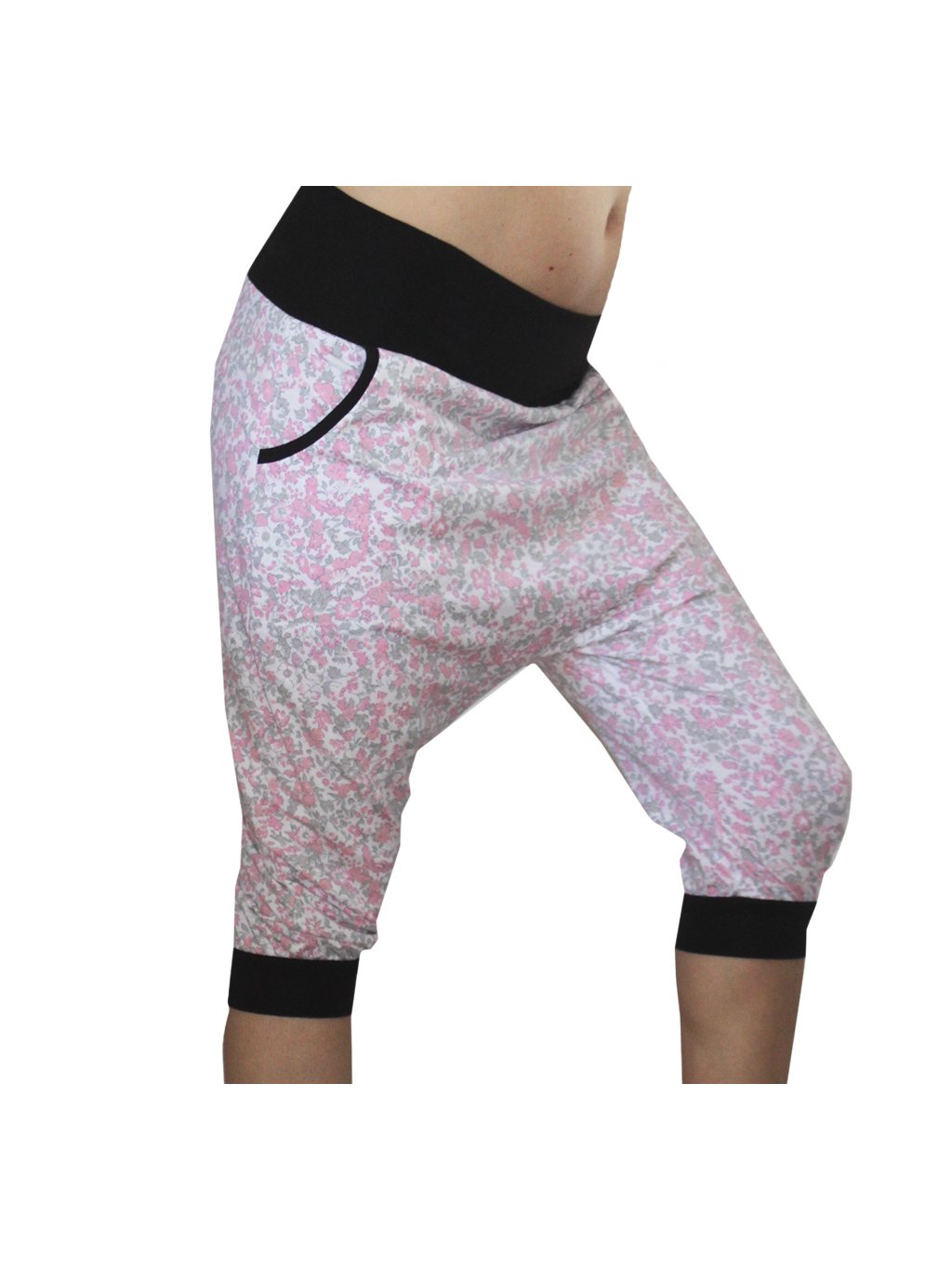 Turecké 3/4 kalhoty pod kolena jsou z květovaného růžovo bílého materiálu. Materiál bavlna, česká výroba. |