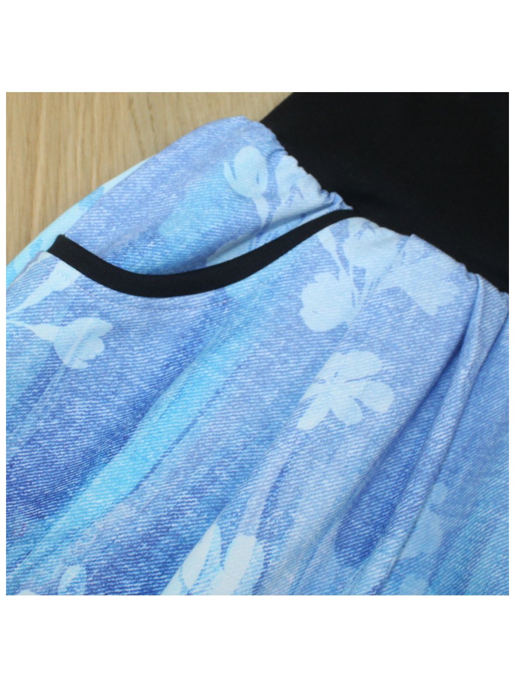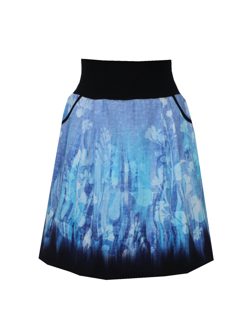 Tato sukně je balonového střihu, mírně rozšířená. V pase se 4 sklady. Sukně je z dvojitého materiálu - vrchní úpletový materiál a spodní spodnička. V dolním kraji jsou materiály sešité a vytvářejí mírný balonek. V pase je sukně zapravená do pružného úpletu, širokého 12 cm, sukně se dá nosit na bocích i v pase. Sukně má v bocích kapsy. |