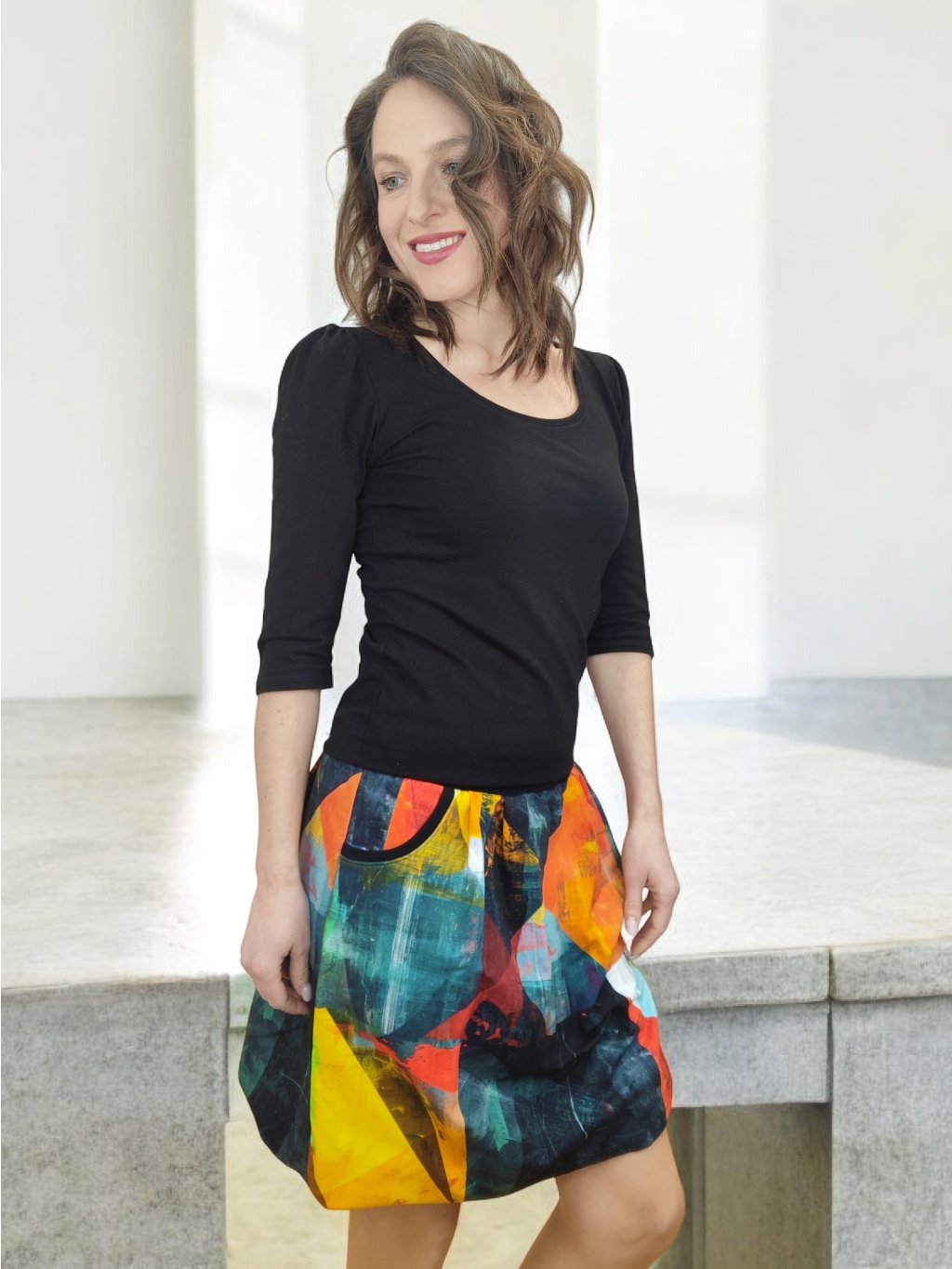 Tato balonová sukně přináší do šatníku závan hravosti i elegance. Vzor barevné mozaiky působí jako malované světlo na látce – každá barva má svůj tón, který spolu s ostatními vytváří harmonickou melodii. Střih sukně je promyšlený do posledního detailu, aby lichotil postavě a zároveň poskytoval pohodlí po celý den. Díky pružnému pasu ji můžete nosit v pase pro zvýraznění siluety, nebo na bocích pro ležérnější vzhled. Balonový tvar dodává sukni živý pohyb, který krásně reaguje na každý krok. Látka s vysokým podílem bavlny je měkká na dotek, příjemná k pokožce a ideální pro celoroční nošení. Sukně se skvěle kombinuje s jednobarevným topem či svetrem, ať už do města, do práce nebo na odpolední setkání s přáteli. Je to kousek, který zaujme, ale nikdy nepřehluší Vaši osobnost.