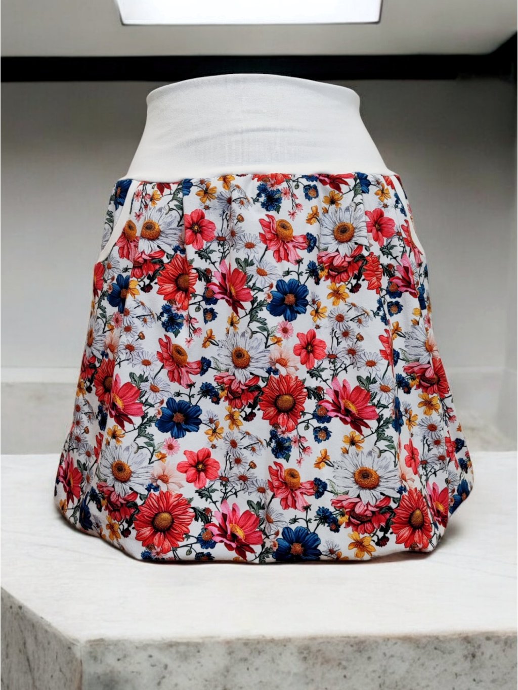Balonová sukně KATY, kapsy, kopretiny, bílý pas