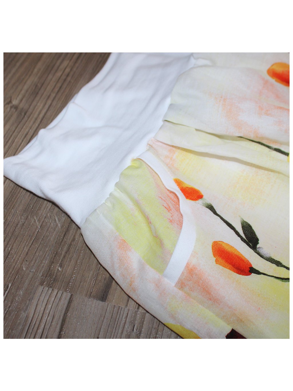 Vrchní materiál na sukni je jemný bavlněný materiál.Materiál v pase je bavlněný úplet s elastanem.Podšívka - jemná, pružná, polyester. |