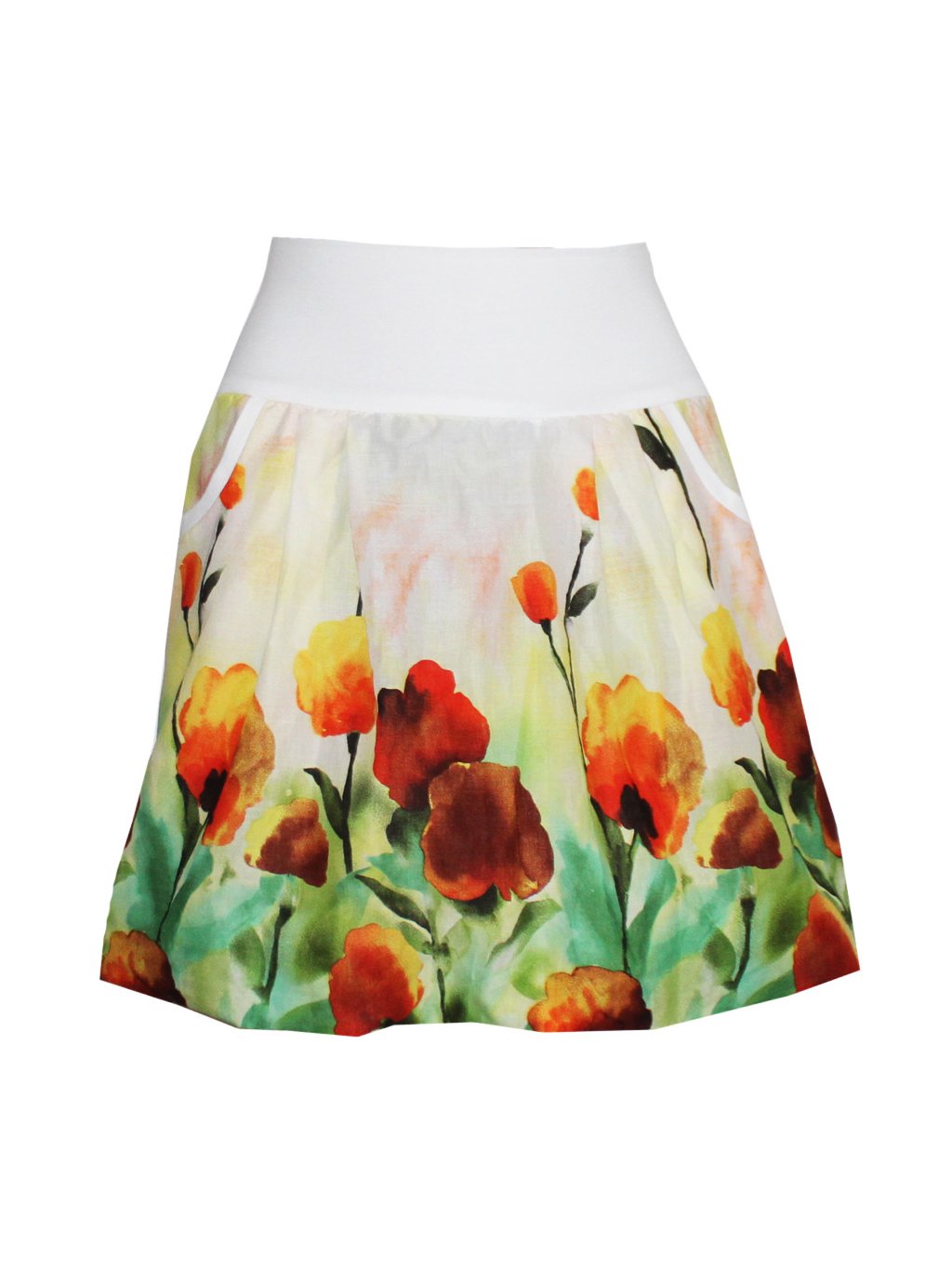 Balonová zeleno oranžová sukně, kapsy, pas bílý
