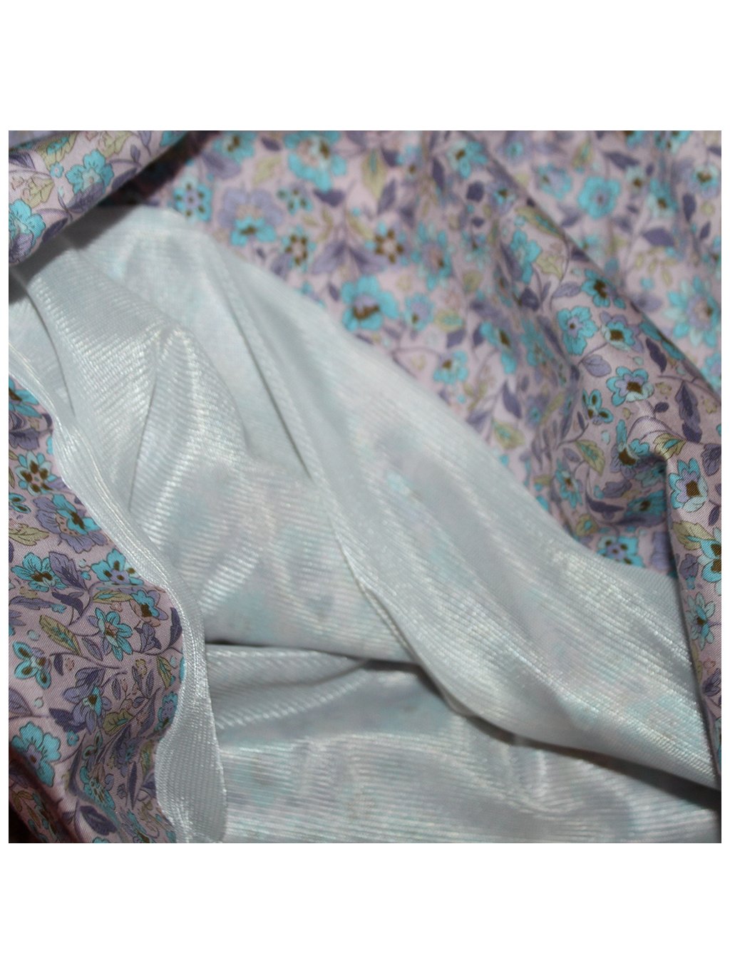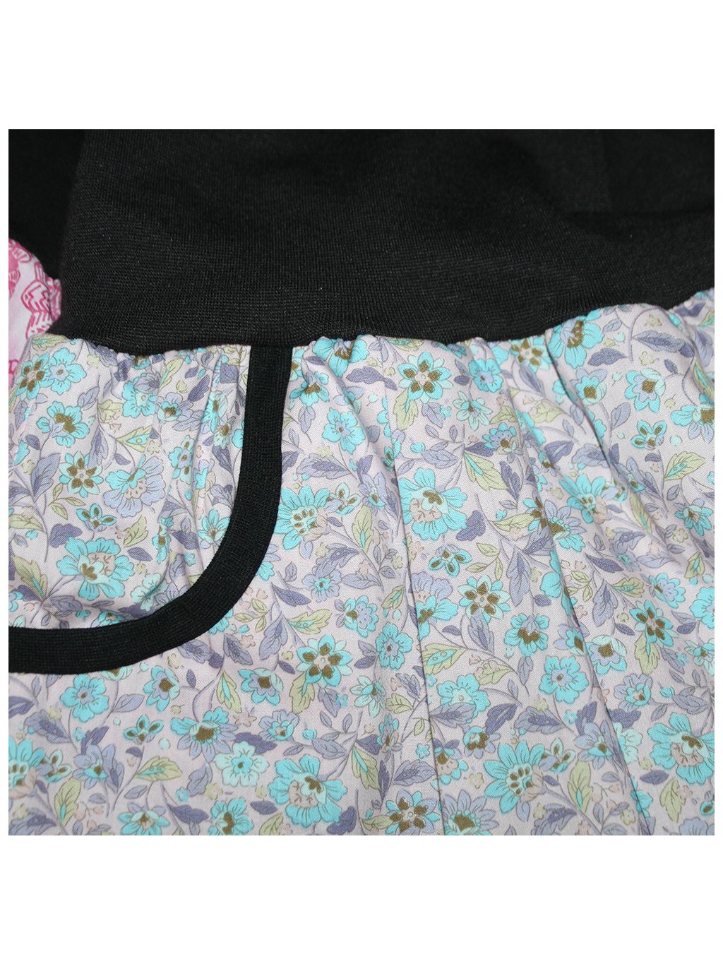 Sukně je ušitá ze tří druhů materiálů. Vrchní materiál na sukni je bavlněné plátno české výroby. Kvalitní lehký bavlněný satén.Nepruží. Látka je růžová s drobnými modrými květy. Materiál v pase je viskozový úplet s elastanem české výroby. Podšívka - jemná, pružná, polyester. |