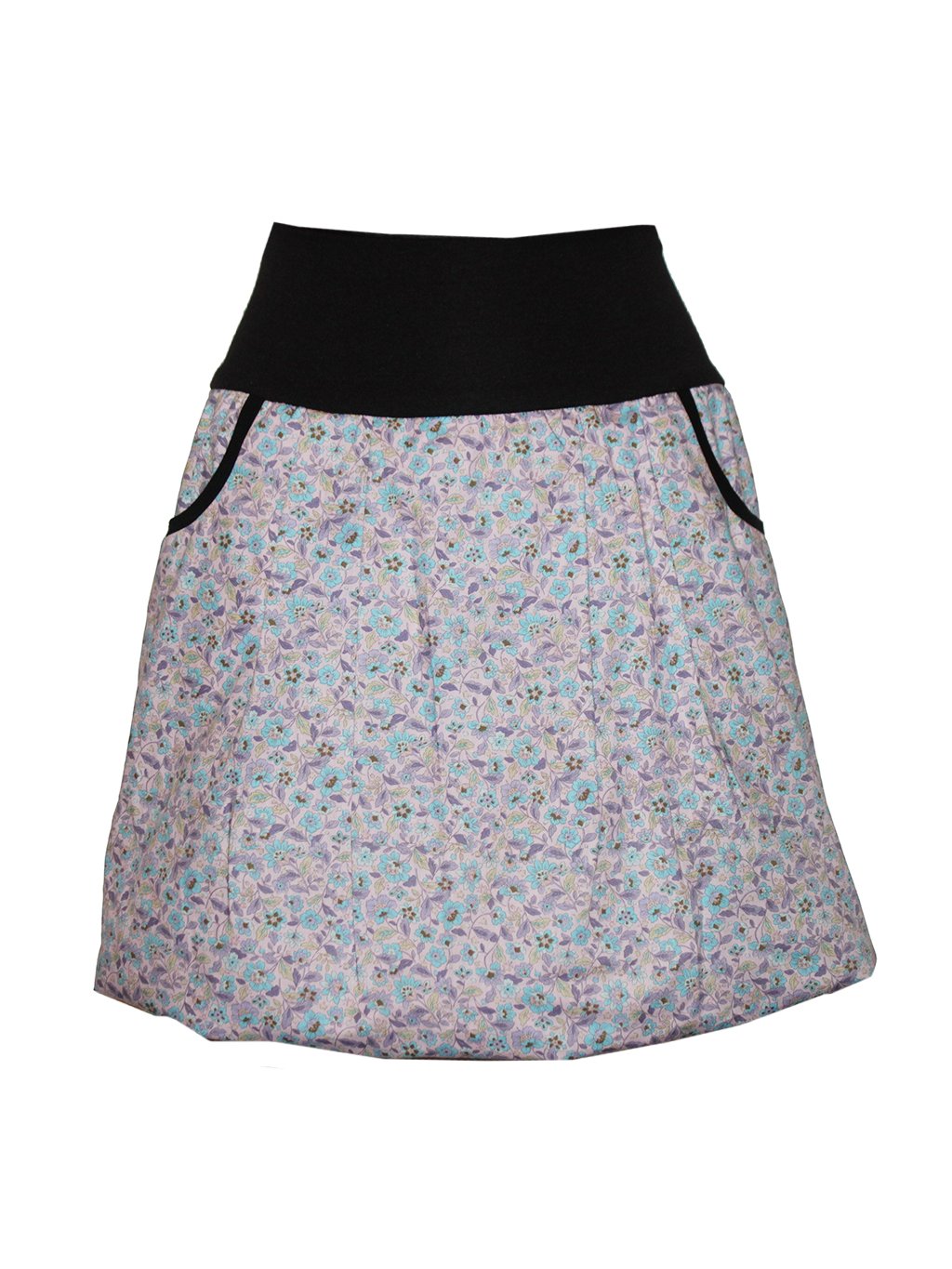 V pase je sukně zapravená do pružného úpletu, širokého 12 cm. Sukně se může nosit v pase i na bocích. Sukně má v bocích kapsy s černým lemem. |