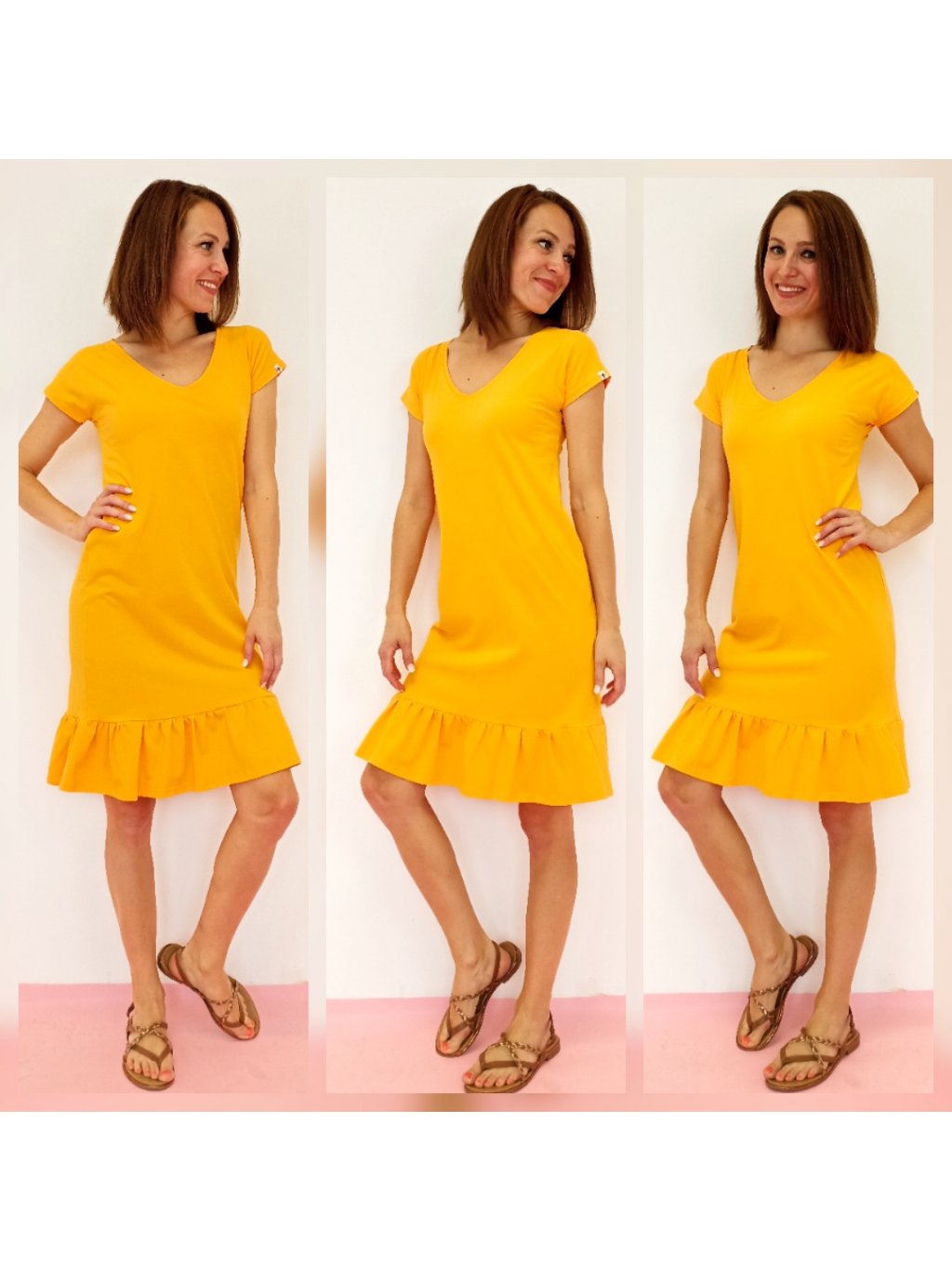 Šaty jsou poslední kus - žluto oranžové ve velikosti S, délka 100 cm.