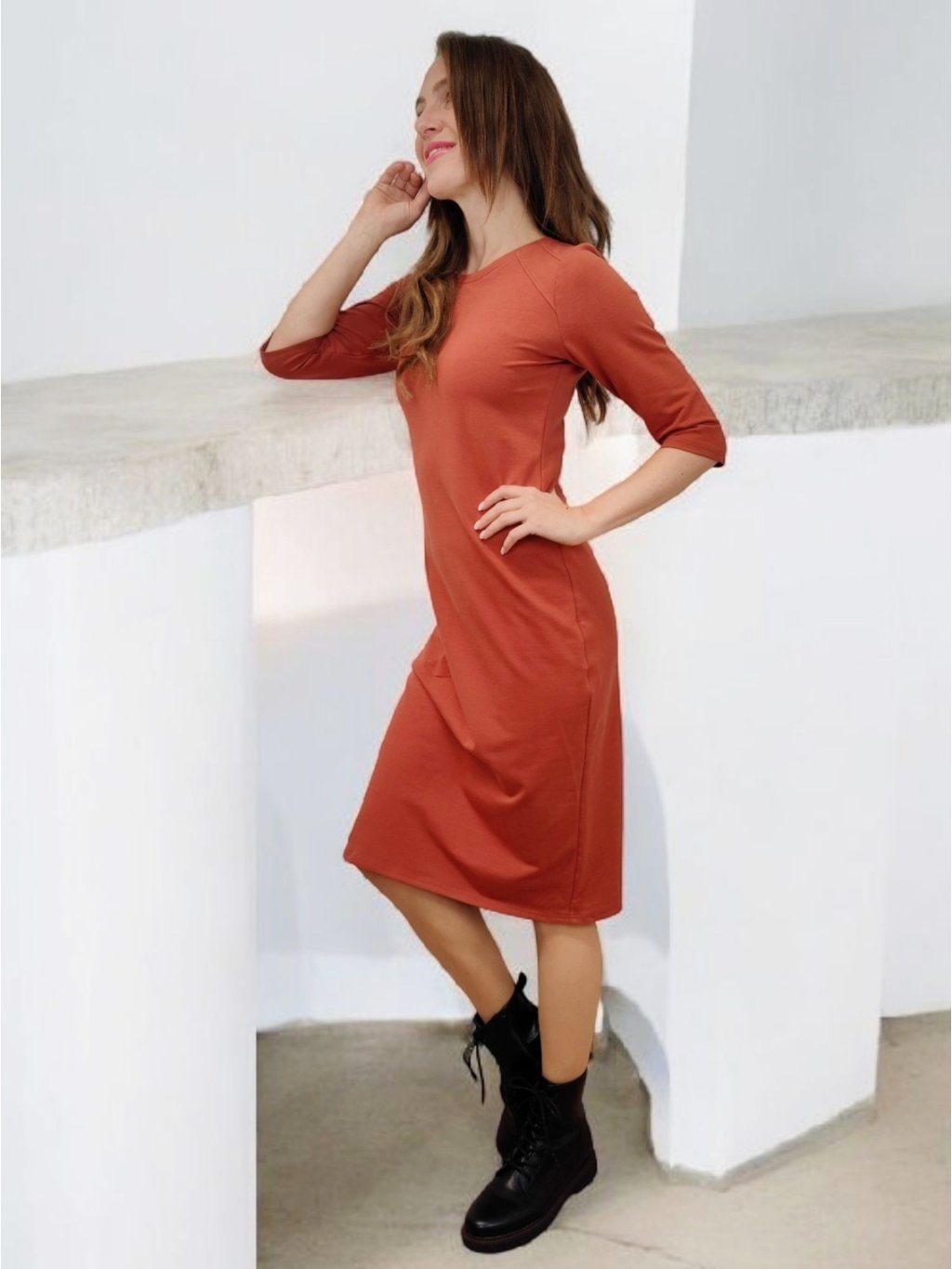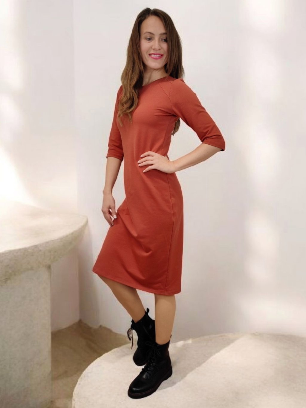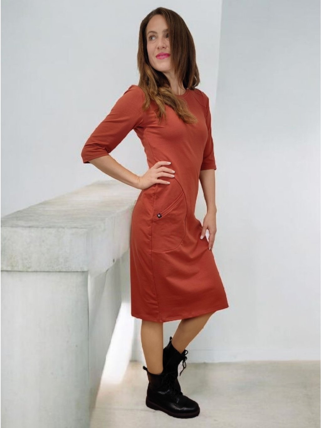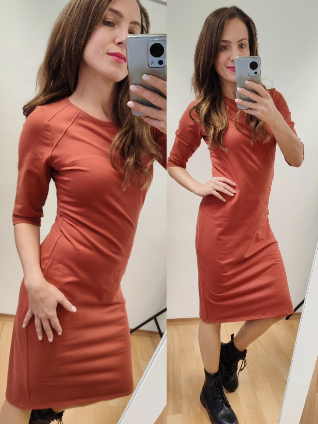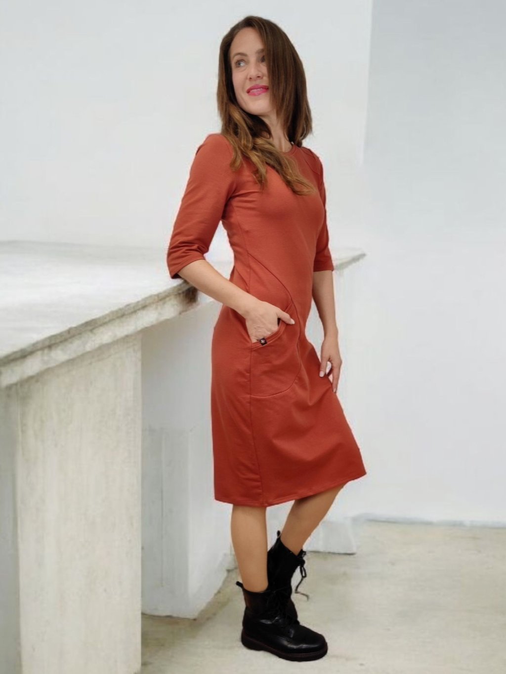 Šaty Audrey Equal v cihlové červené barvě přinášejí do šatníku jemný nádech tepla a elegance. Střih je obdobný jako u klasických modelů Audrey – mírně přiléhaví, komfortní. Designově zajímavým prvkem je jedna kapsa, která dodává modelu osobitost a praktický rozměr. Kulatý výstřih zachovává rovnováhu jednoduchosti a ženskosti. Šaty šijeme ve variantách různých délek a přizpůsobíme je i velikostně přesně pro vás. Jsou vhodné pro podzimní i zimní dny, případně vrstvení s kabátem nebo vlněným svetrem.