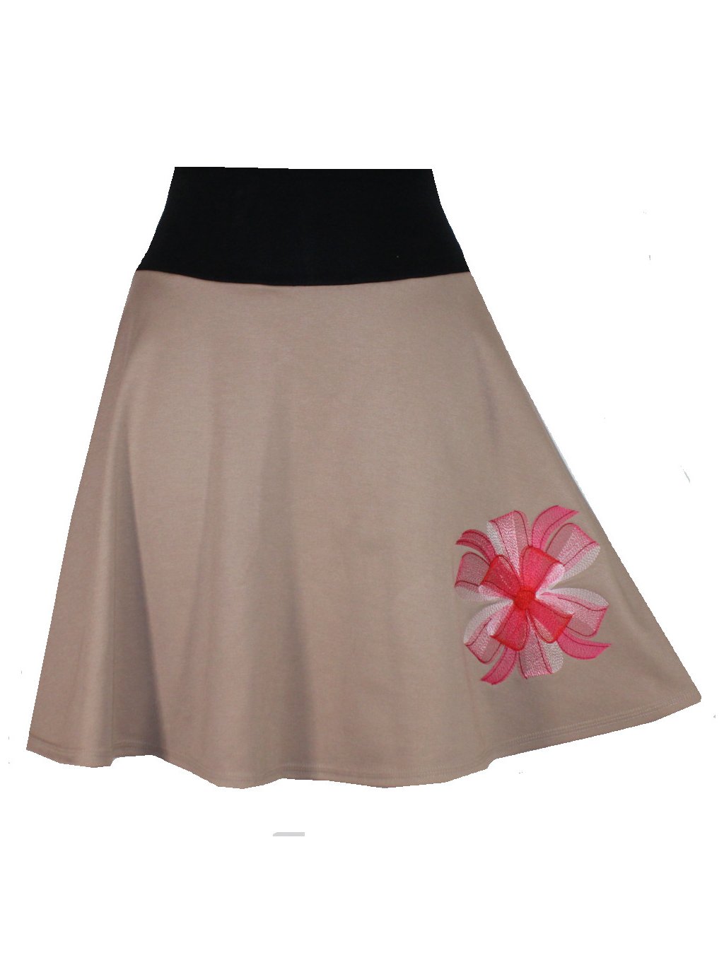 Béžová sukně je půlkolového střihu s výšivkou mašle.