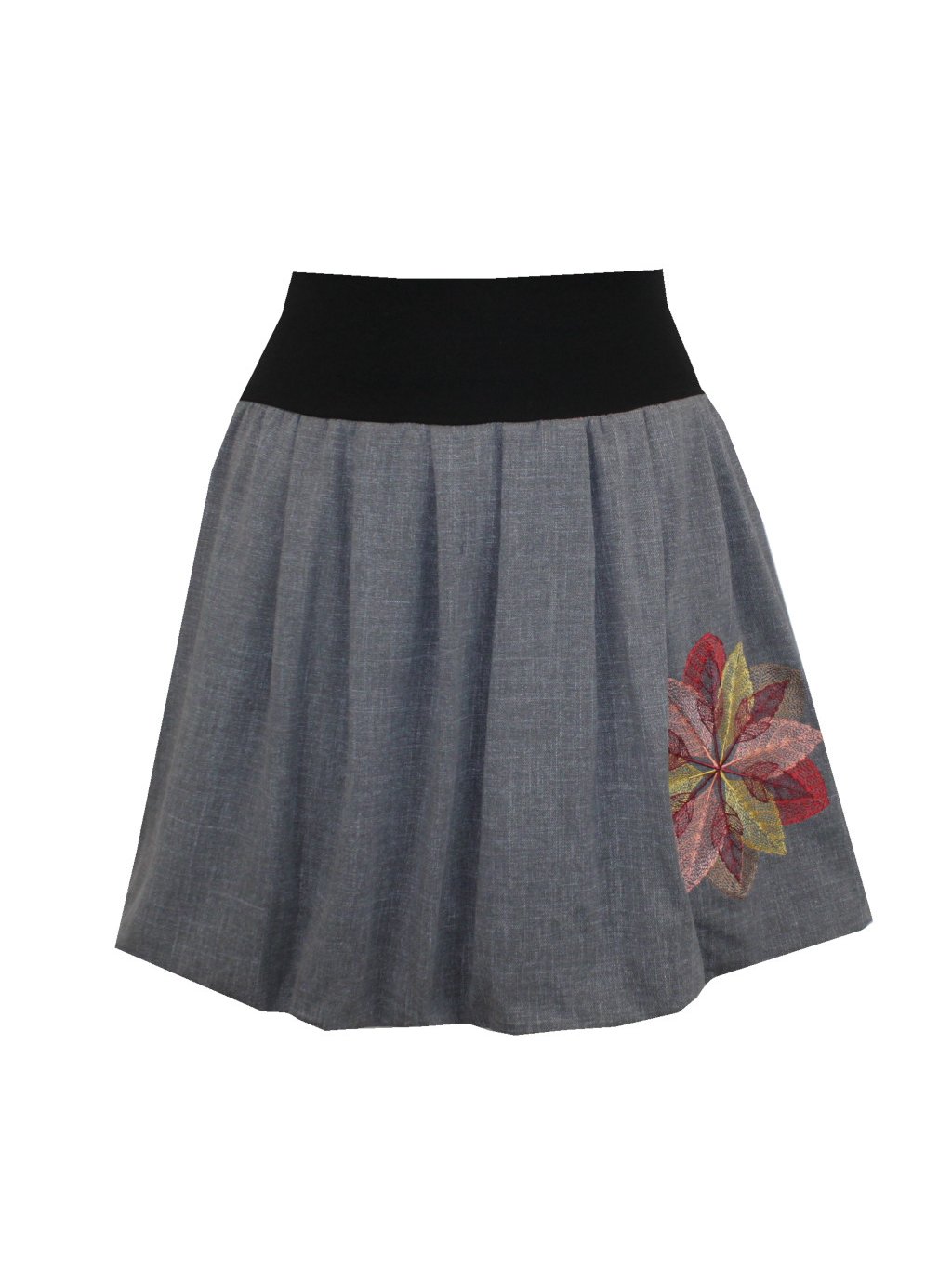 Na boku sukně je výšivka - vícebarevná.
