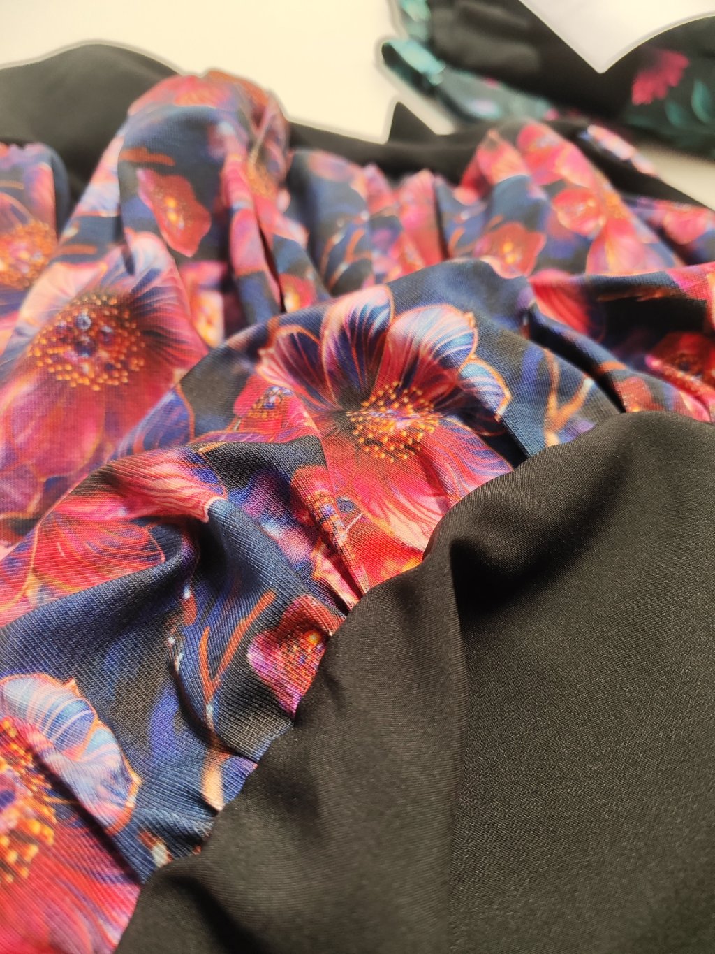 Červeno-modré květy rozkvétají na látce jako letní zahrada v plném slunci. Každý odstín hraje svou melodii – červená přináší vášeň a energii, zatímco modrá vnáší klid a hloubku. Dohromady tvoří harmonii, která osloví ženy, jež se nebojí být vidět.