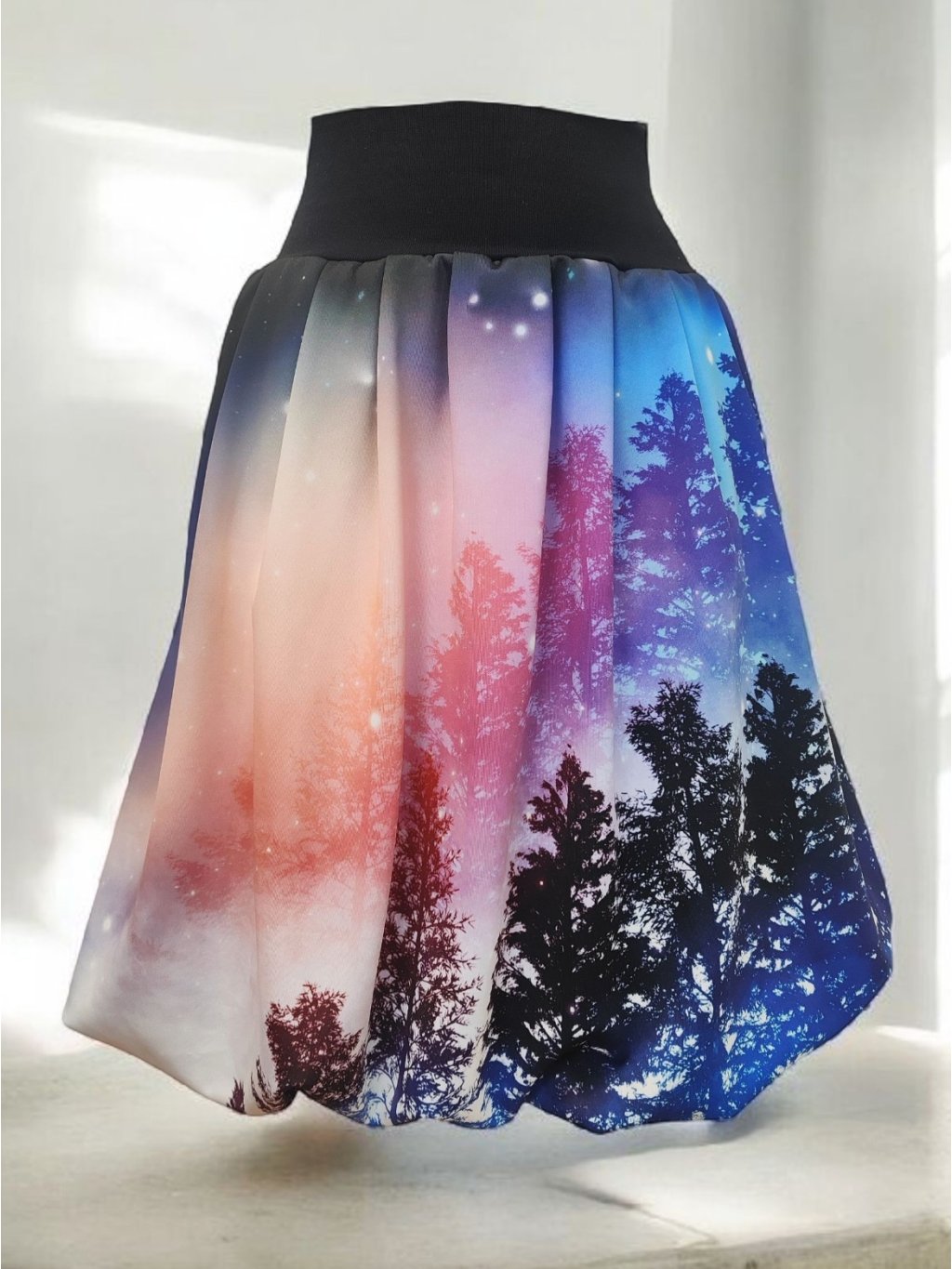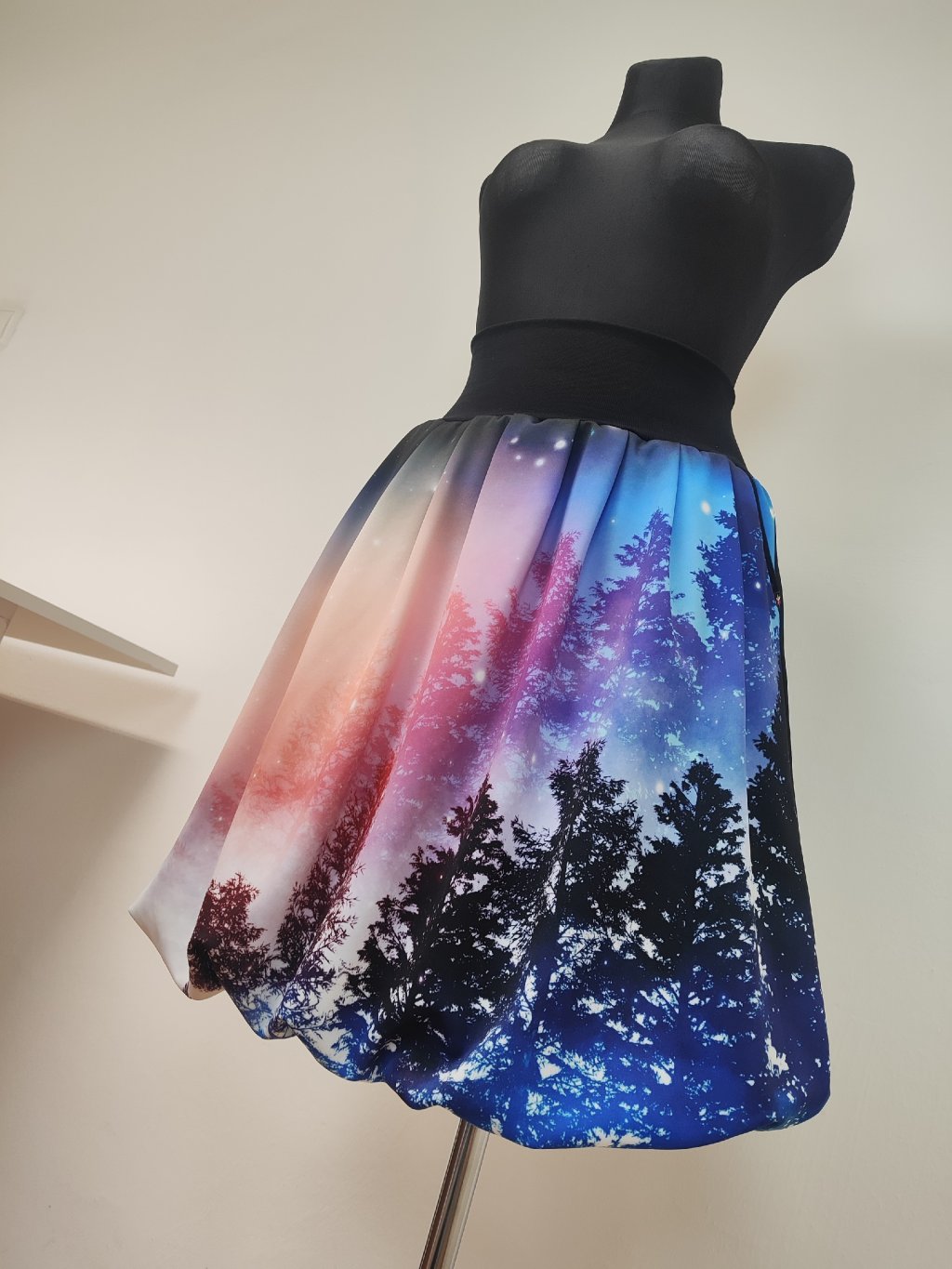 Tato sukně je balonového střihu, pravidelně skládaná v pase. Sukně vytváří bohatý balonek. Střih STELA.