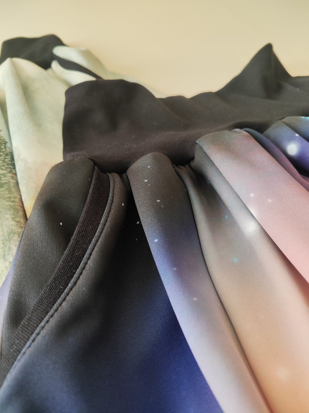 V pase je sukně zapravená do pružného úpletu, širokého 12 cm, sukně se dá nosit na bocích i v pase.