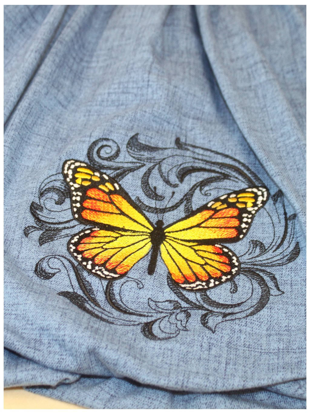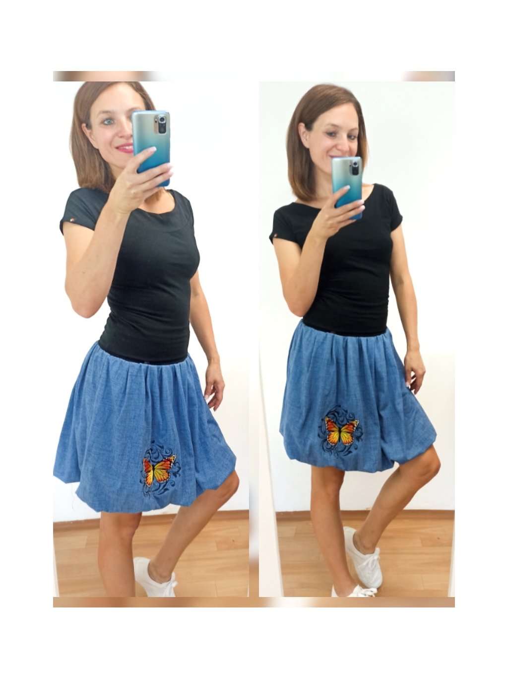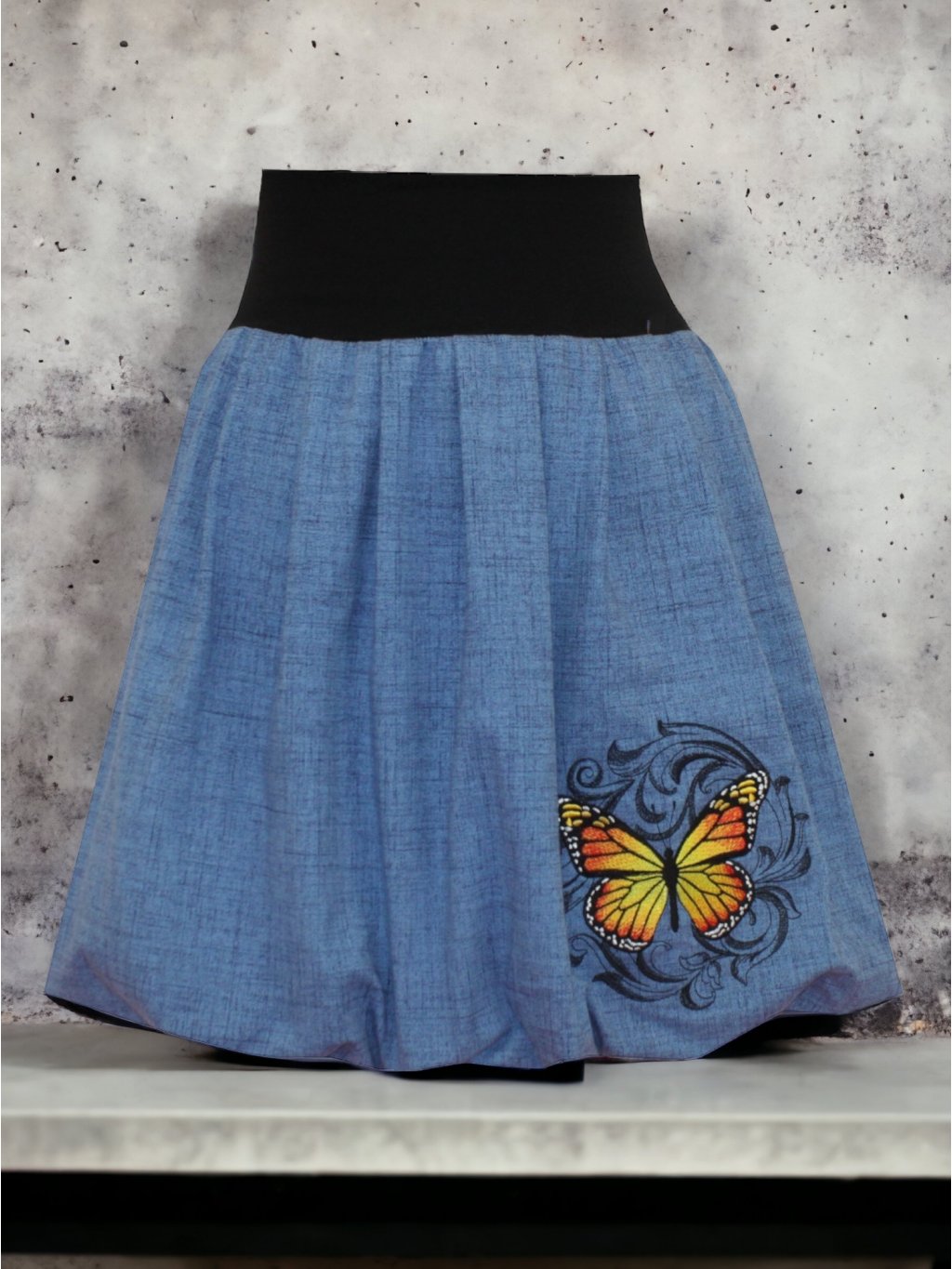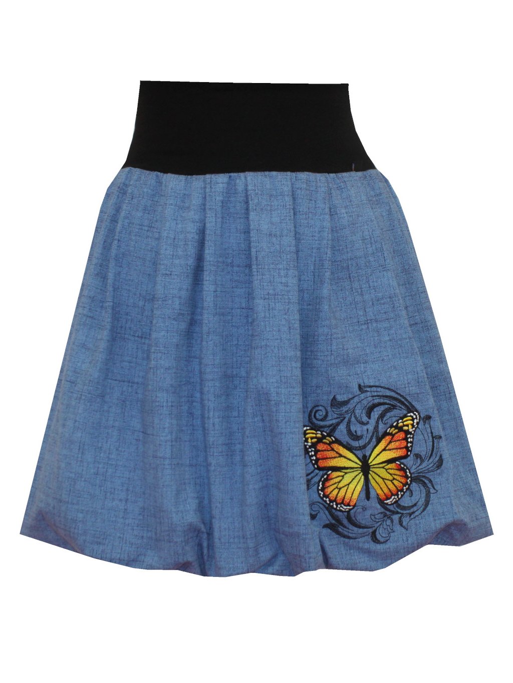 Bohatě balonová sukně STELA, středně modrá imitace džínoviny, motýl