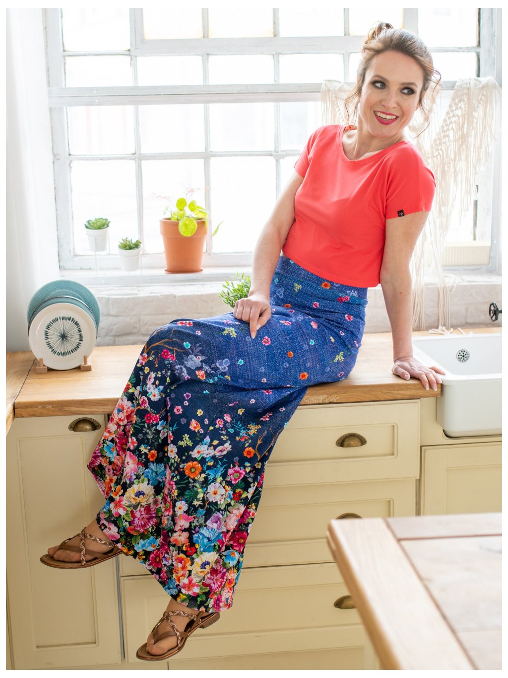 Sukně je ušitá z džínově modré látky s barevnými květy. Skvělým kousek do šatníku na jaro/léto.