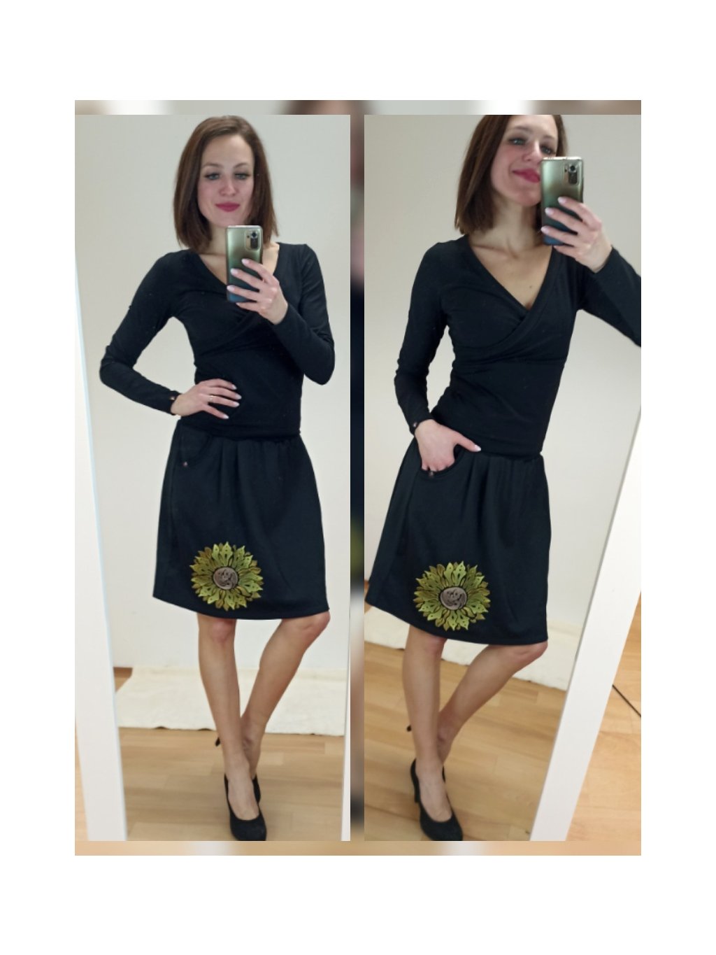 Černá áčková sukně NINA, sklady, kapsy, slunečnice