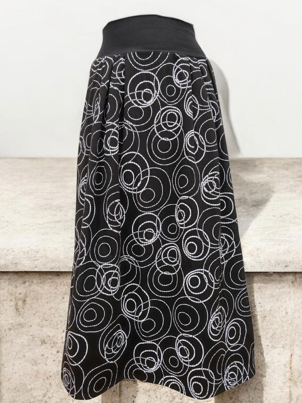 Dlouhá sukně je rovného střihu, v pase má několik skladů, které vytvářejí áčkový střih k dolnímu kraji.