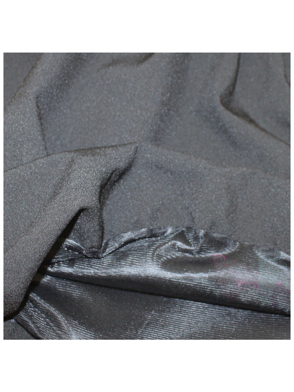 Vrchní materiál je nepružný černý, polyesterový, mírně trčavý, středně silný, mírně se leskne. 100% poylester.