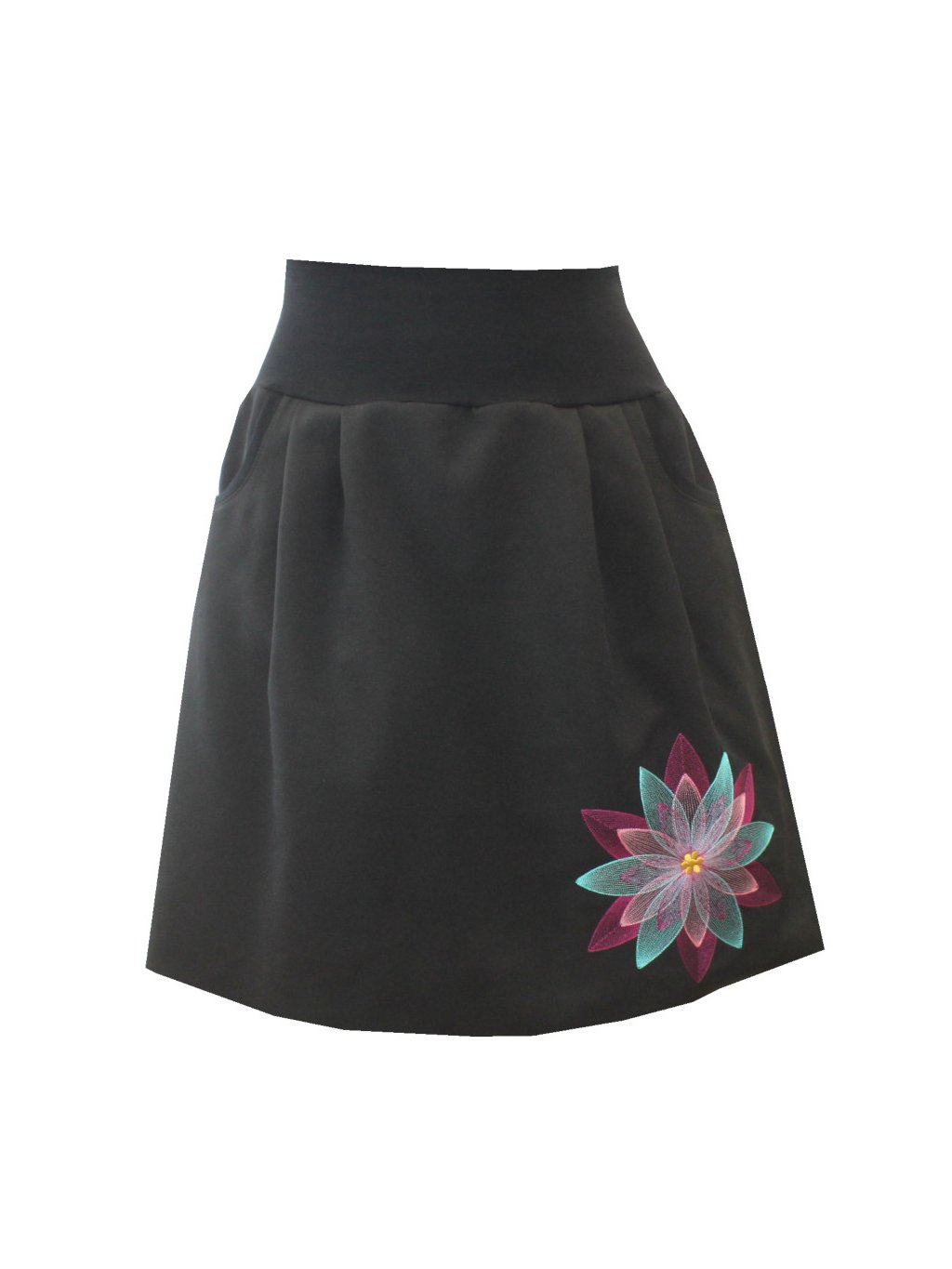 Černá kostýmová balonová sukně, barevná mandala, kapsy