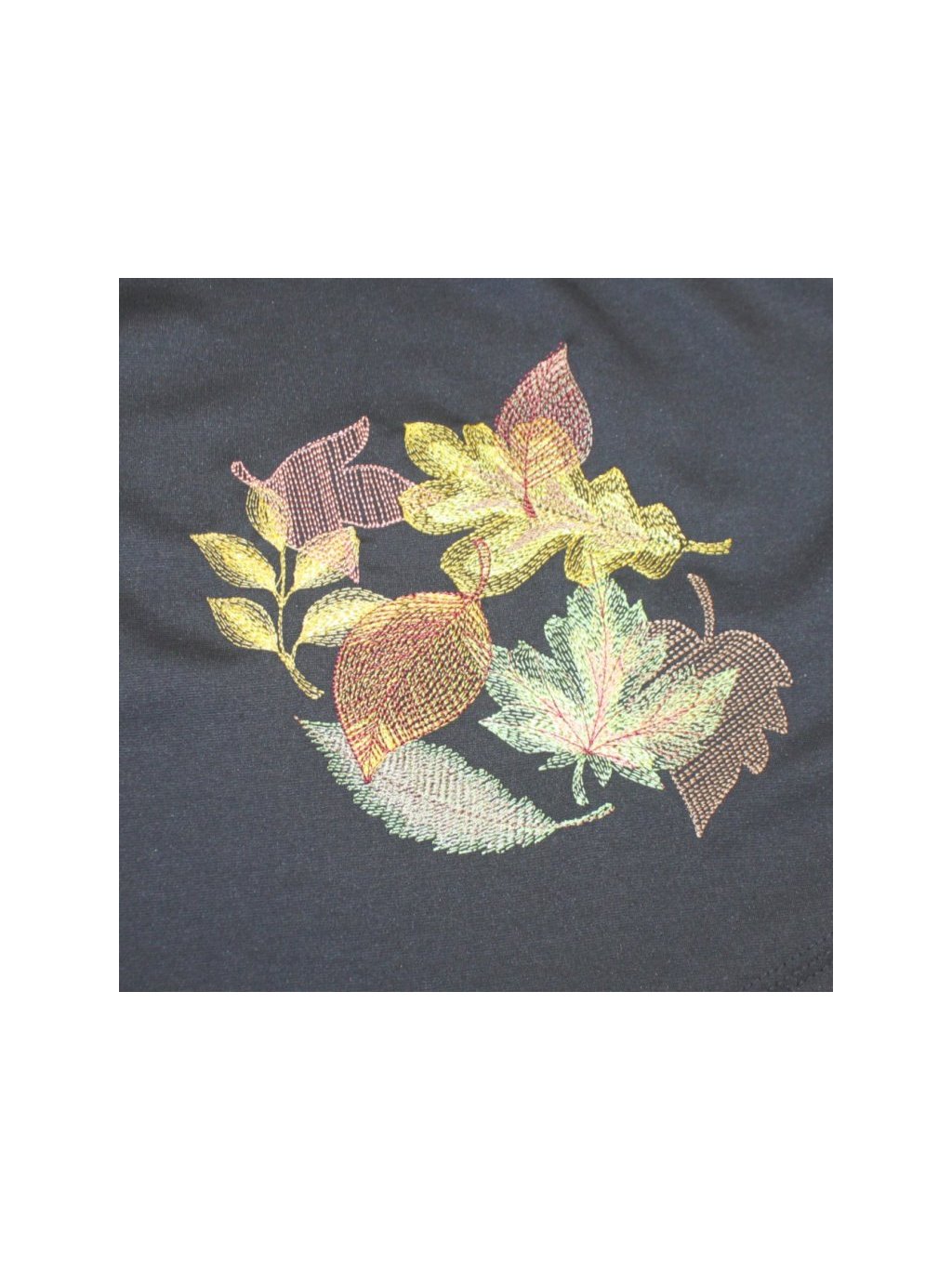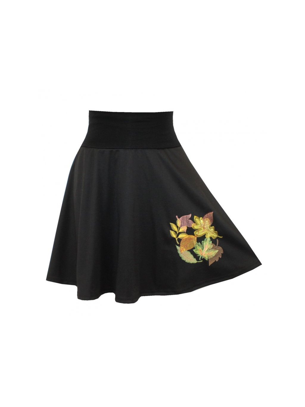 Na boku sukně je vyšitý obrázek - vícebarevné listy.