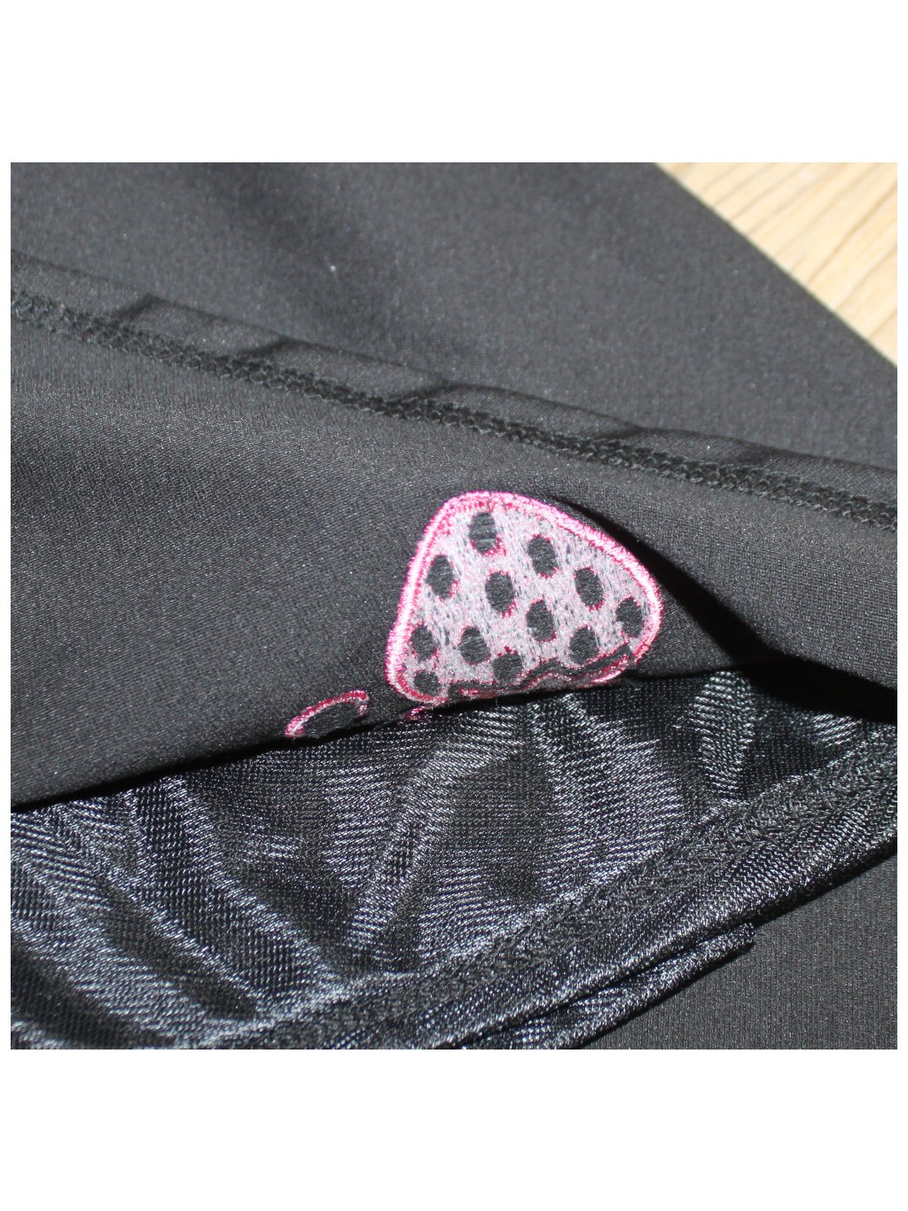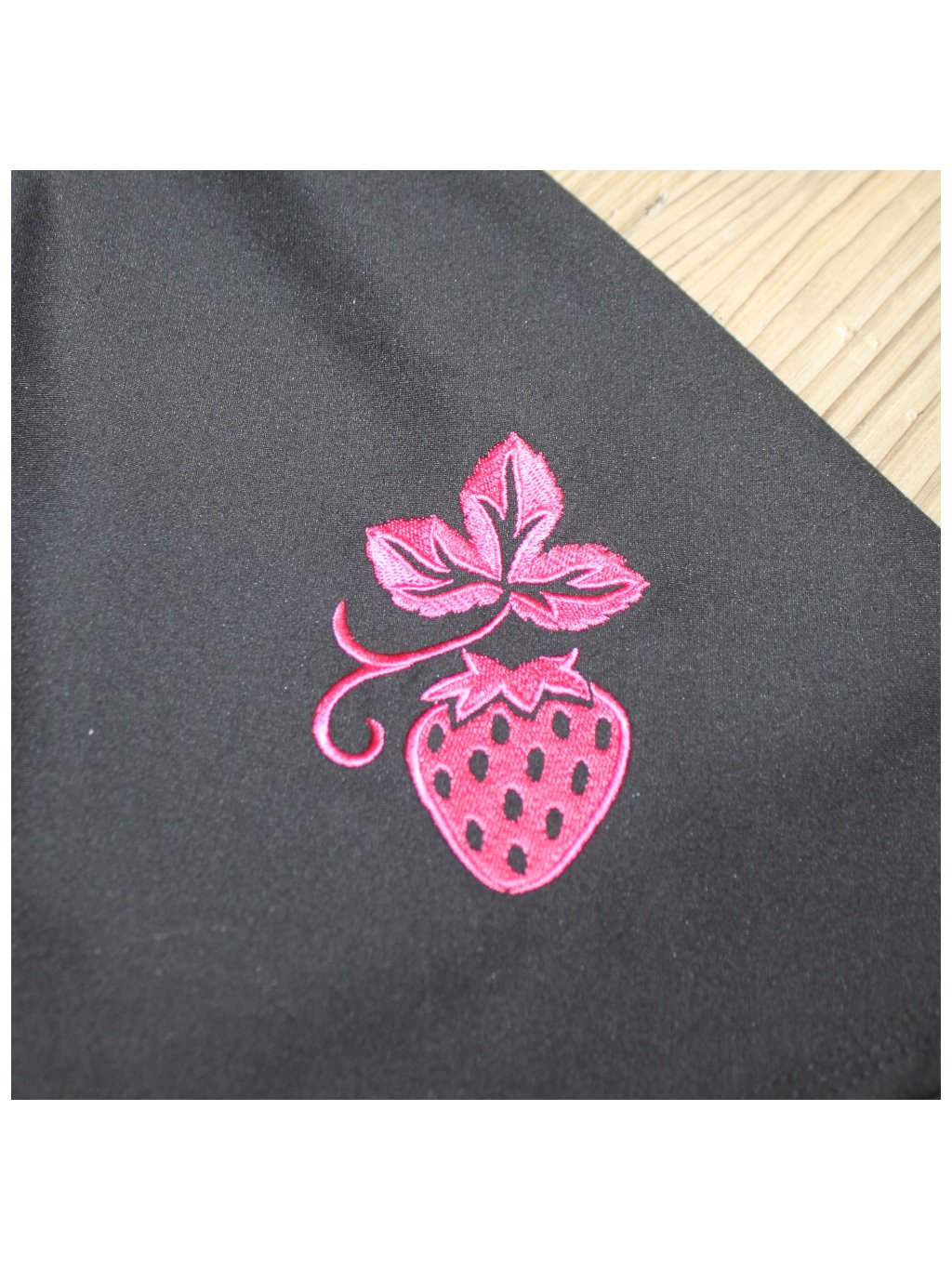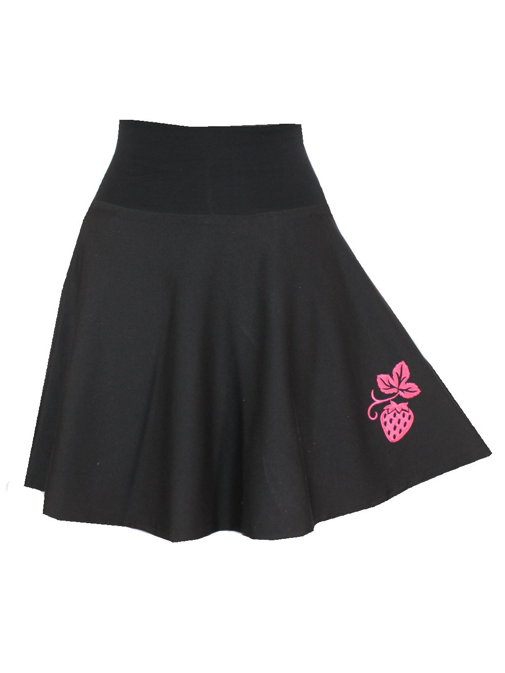 Černá sukně je půlkolového střihu s výšivkou jahody.