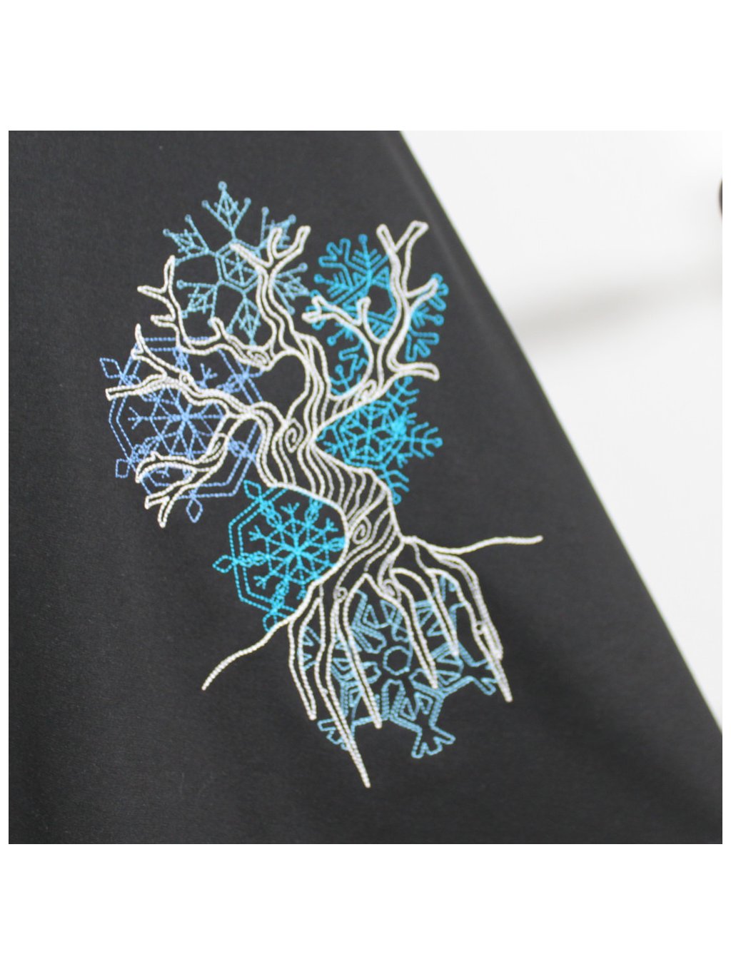 Na boku je výšivka stromu a vloček.