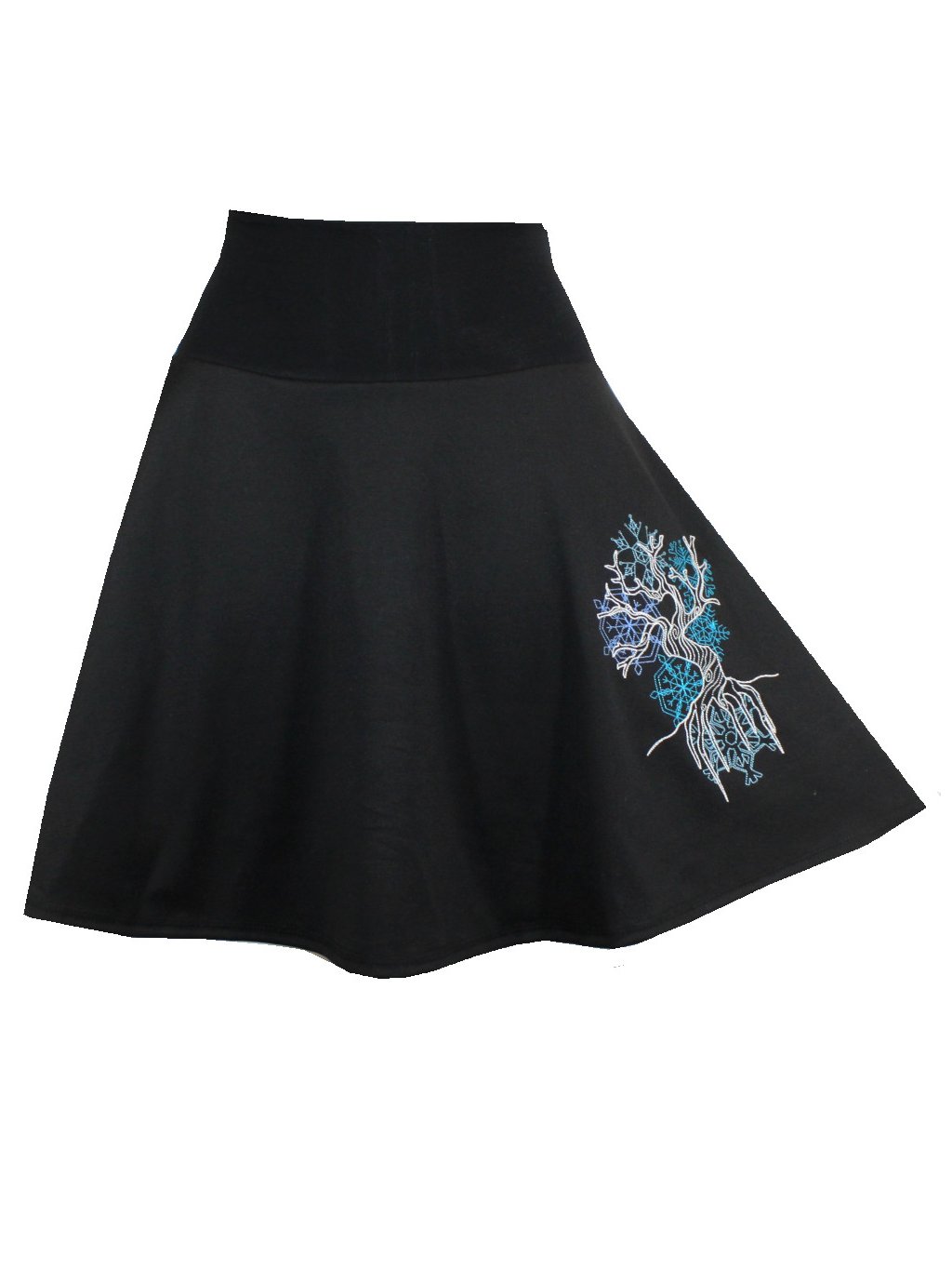 Černá sukně je půlkolového střihu se zimní výšivkou.