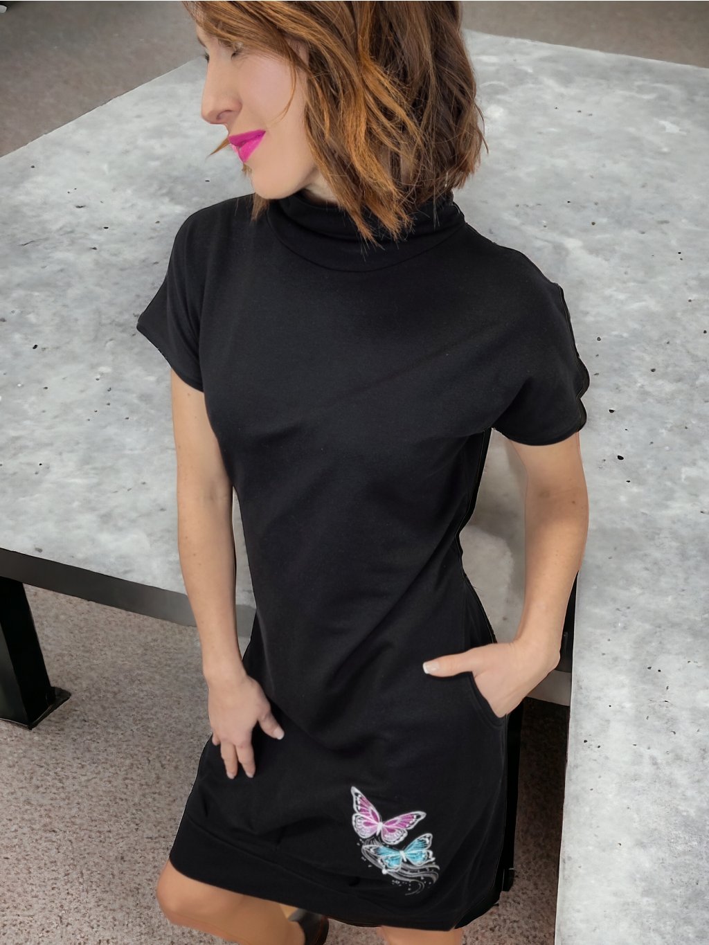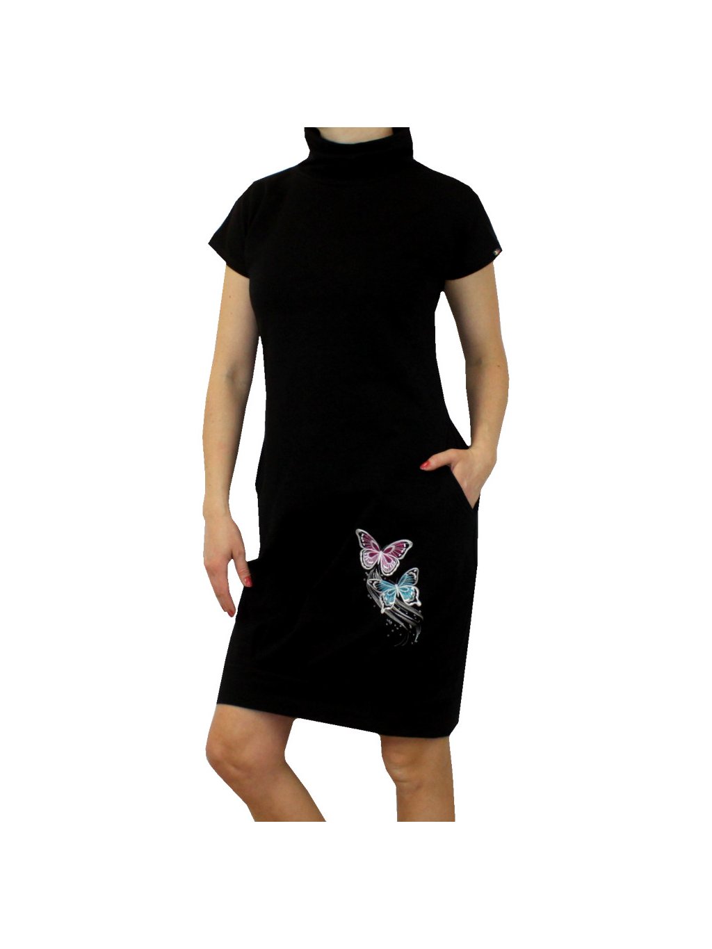 Černé dámské šaty TINA, krátké rukávy, volnější balonkový střih, kapsy, motýlci