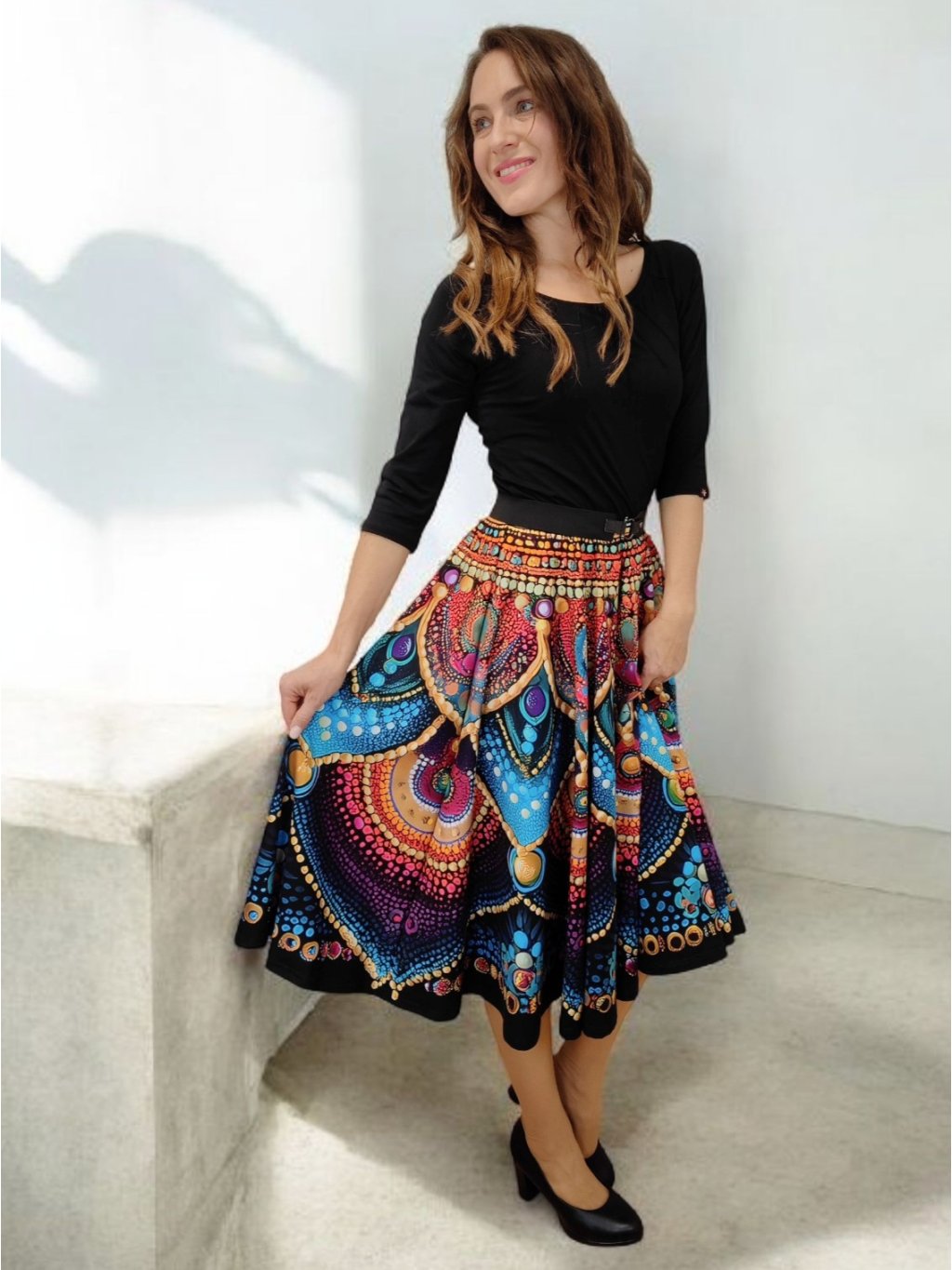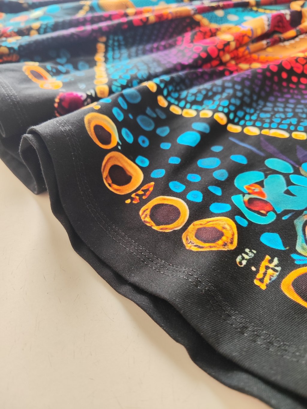 Základní černá jako hluboká noční obloha nechává vyniknout orientálním květům v tónech zlatavé, terakotové a hnědé. Vzor působí teple, uklidňujícím dojmem a vnáší do outfitu nádech exotiky i podzimní hřejivosti.