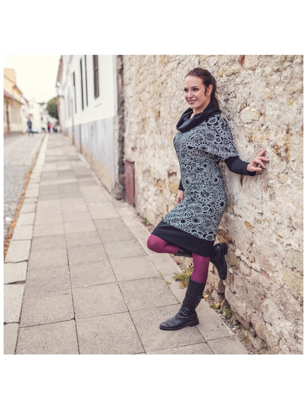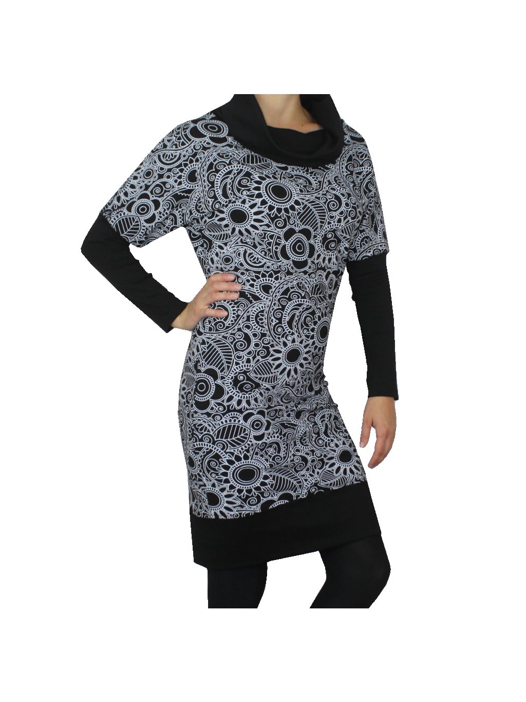 Černé dámské šaty s rolákem, bílé vzory
