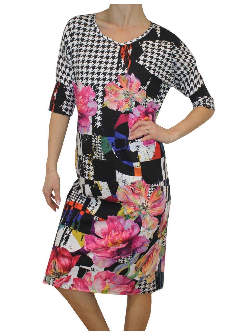Černo-bílé dámské šaty MEDA, volnější střih, barevné květy