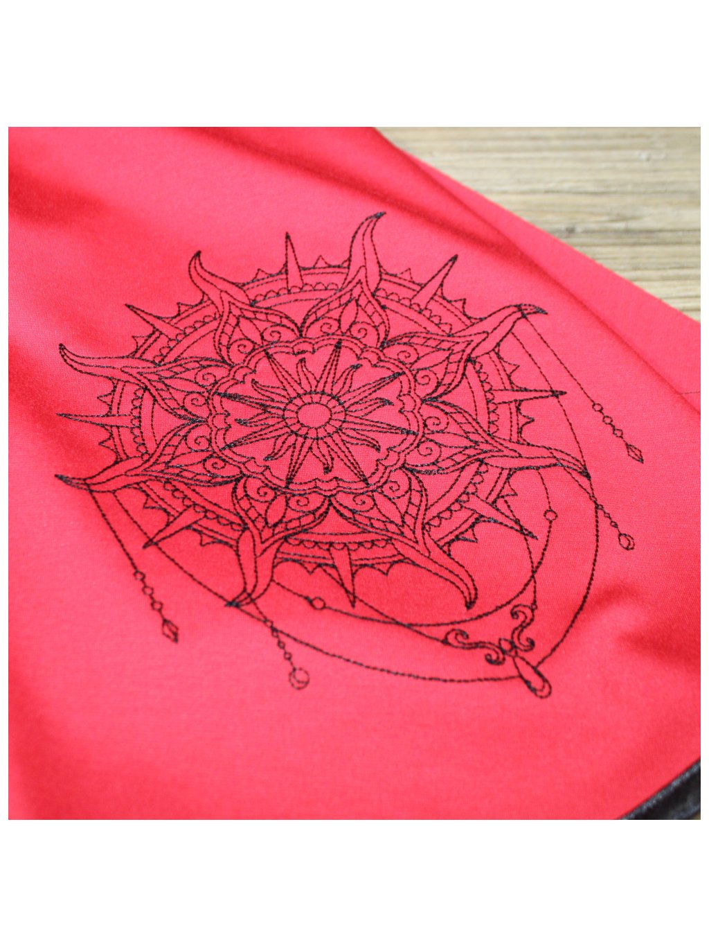 Na boku sukně je vyšitý obrázek - slunce. |
