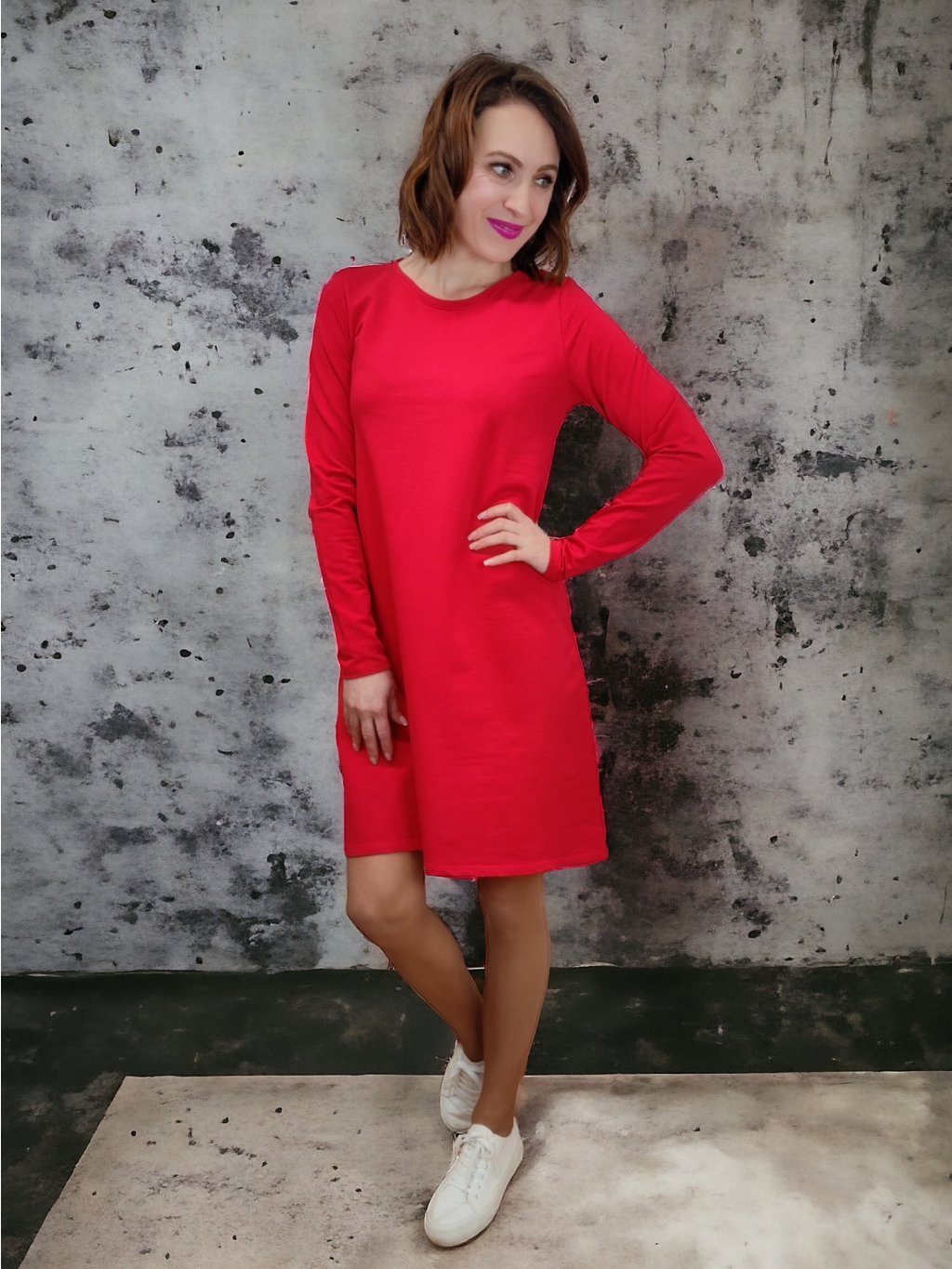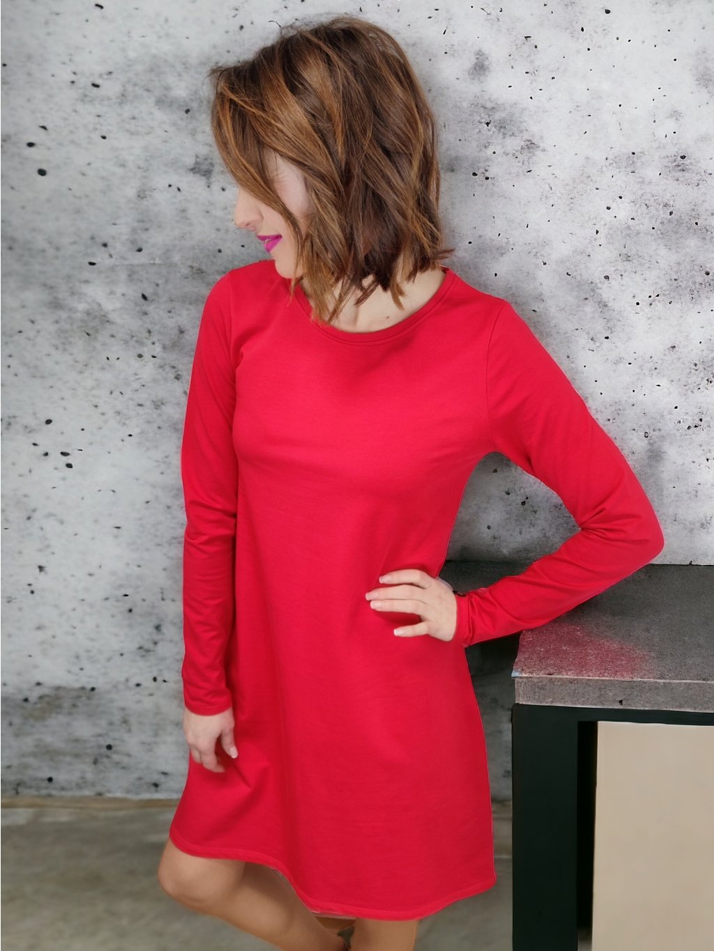 Bavlněné červené volné šaty OLIVIE, dlouhé rukávy