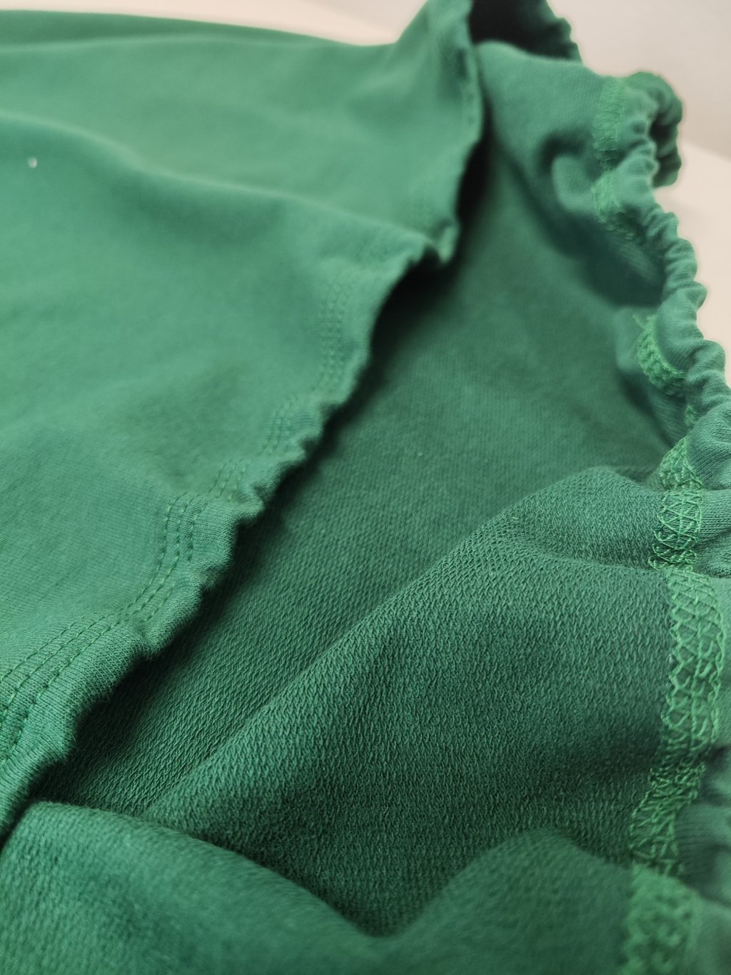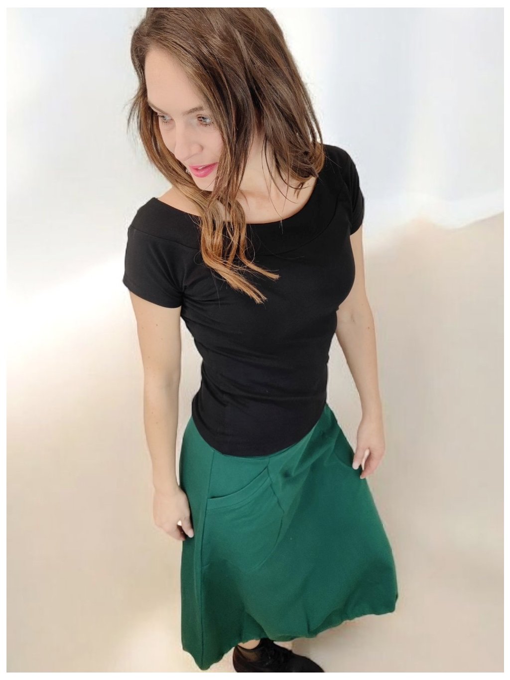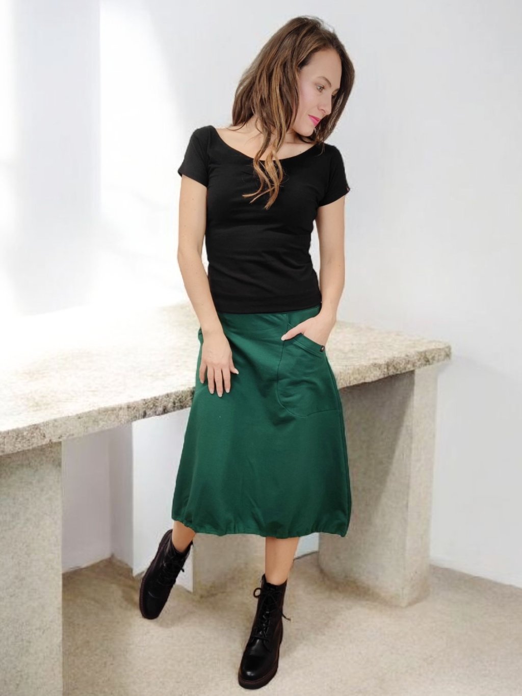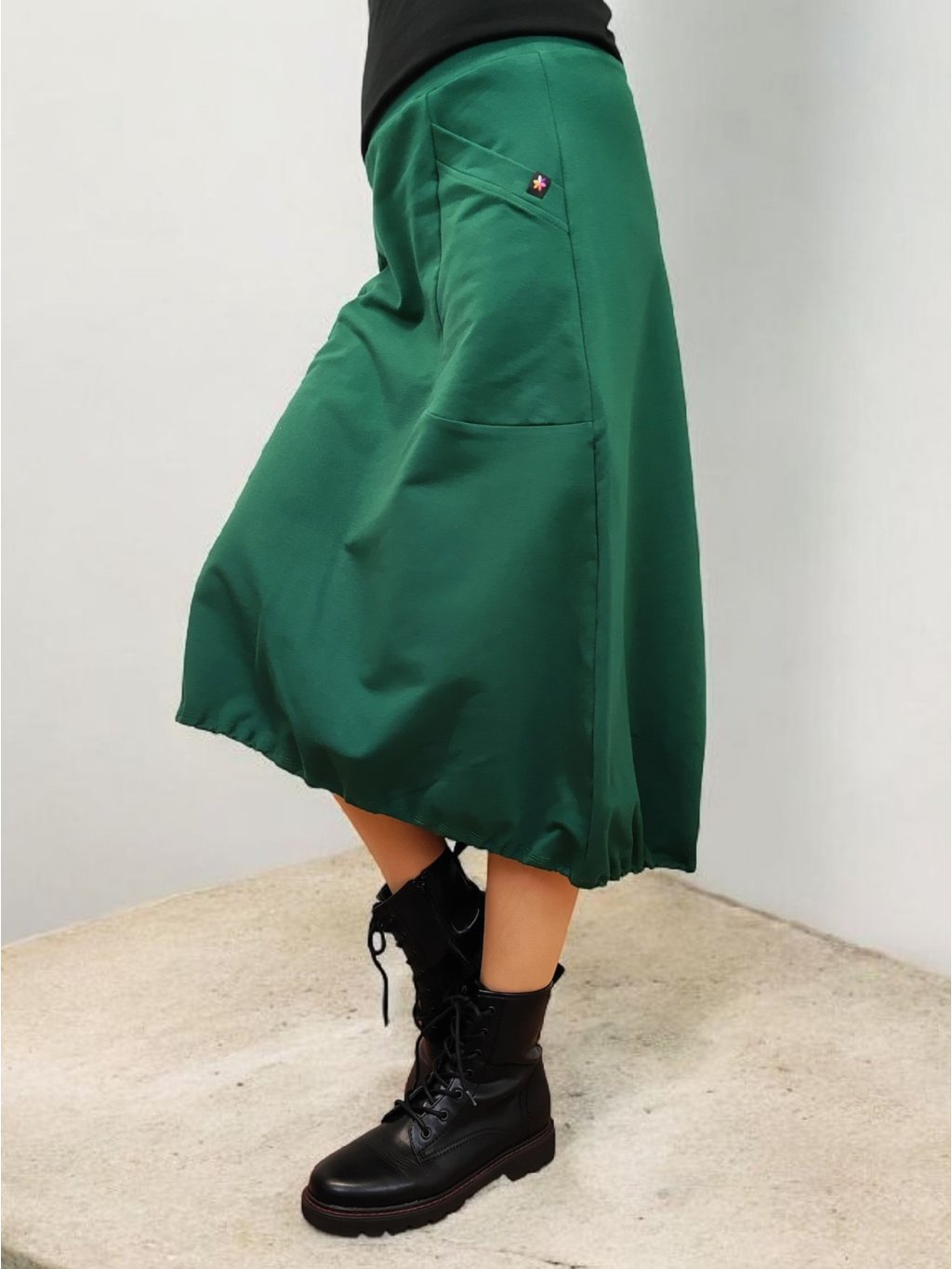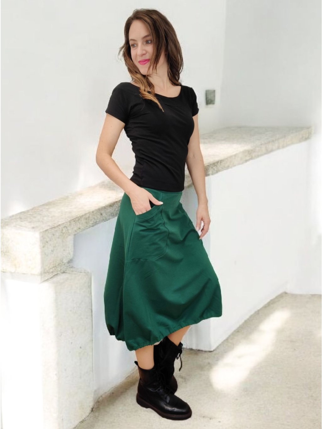 Tato sukně se nosí na bocích, nikoli v pase. Všitá guma je ve stejné barvě jako látka, což působí elegantně a čistě. Spodní část je stažená gumou do balonkového tvaru, díky čemuž sukně působí živě a má přirozený objem. Střih je pohodlný a nápaditý zároveň.