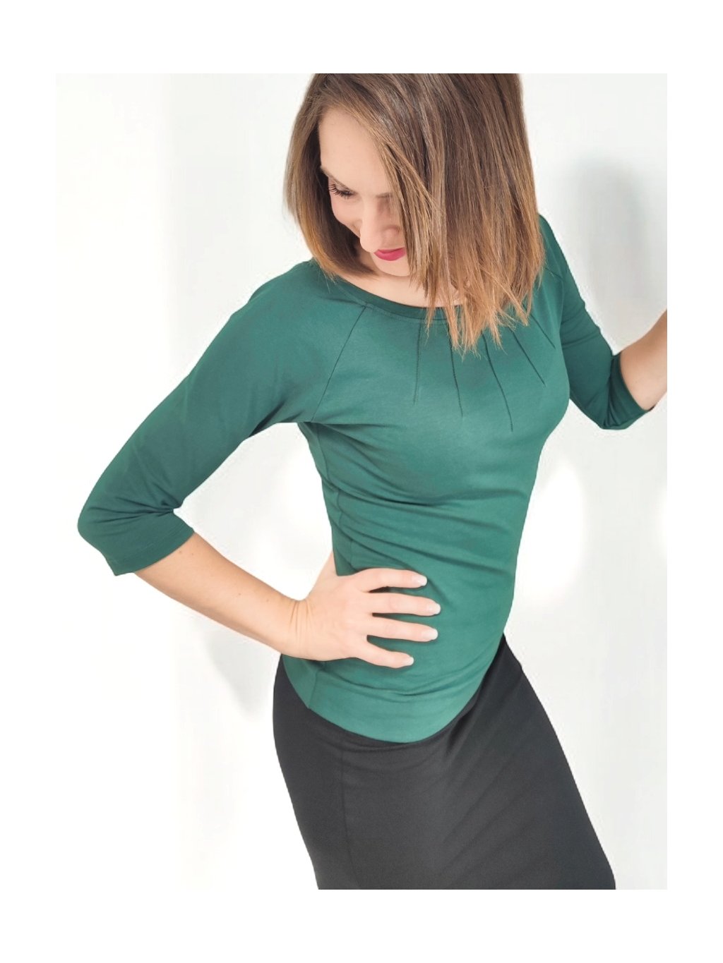 Model BRENDA je typický jemným řasením a prošíváním na předním díle u průkrčníku. Tento detail tričko odlišuje od klasických jednoduchých triček a dodává mu jemně elegantní vzhled. Přiléhavý střih spolu s 3/4 rukávy vytváří vyváženou a ženskou siluetu.