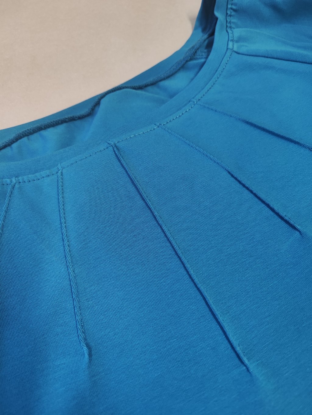 Má zajímavě střihově řešený přední díl s ozdobným prošíváním u průkrčníku. Tričko působí decentně a elegantně. K sukním z naší nabídky vypadá famózně.