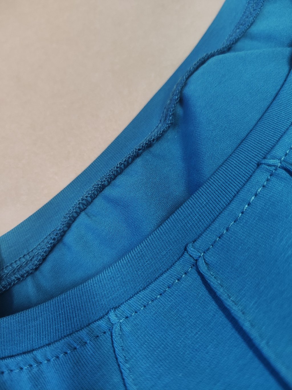 Tričko má jemně přiléhavý střih, který přirozeně kopíruje siluetu. Zajímavým prvkem je ozdobné řasení u průkrčníku na předním díle, které dodává tričku jemně elegantní vzhled. Tento detail odlišuje model BRENDA od klasických jednoduchých triček.