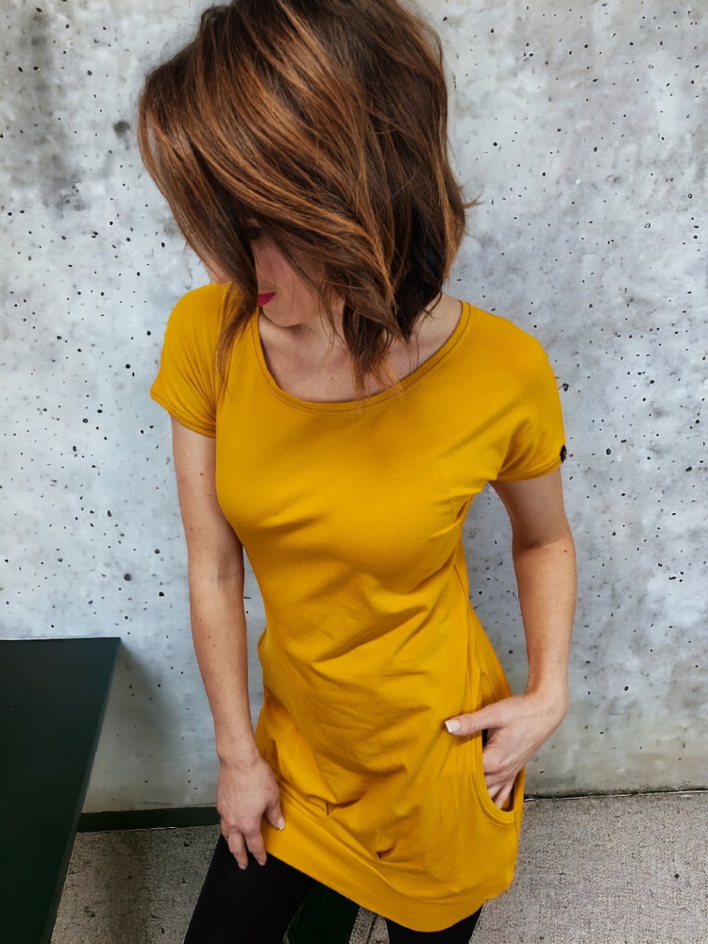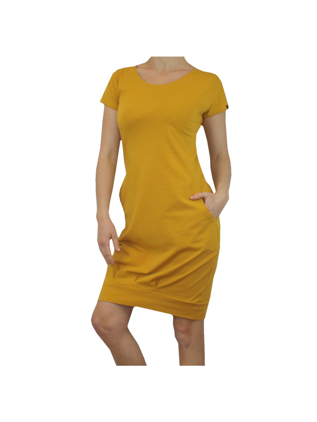Hořčicově žluté dámské letní šaty TEZA, krátké rukávy, volnější balonkový střih, kapsy