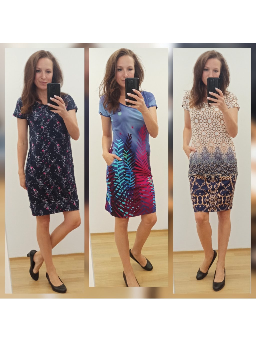 Šaty jsou volnější přes bříško a boky. Pokud šaty chcete upnutější na tělo tak zvolte menší velikost.