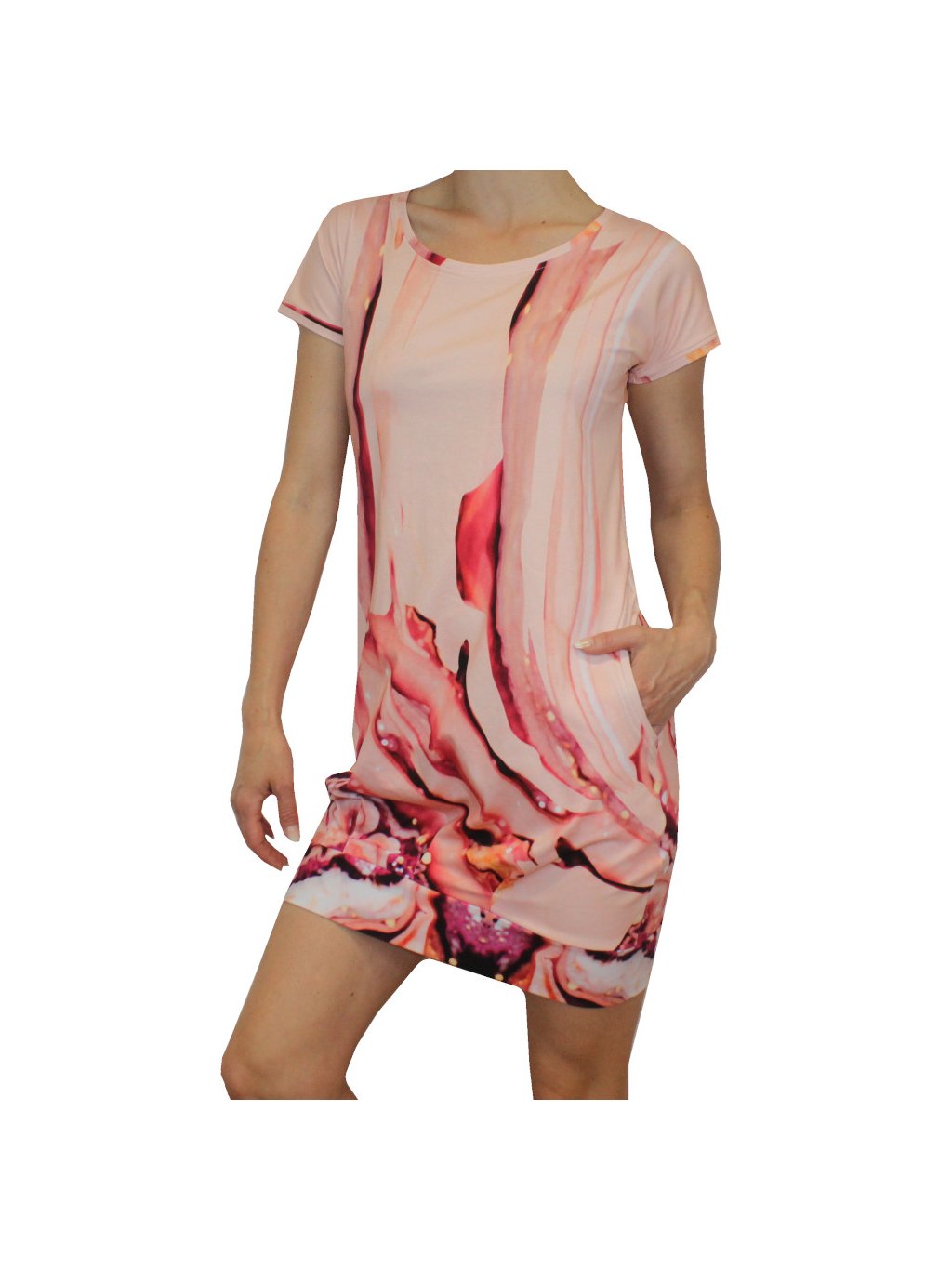 Dámské letní šaty TEZA, krátké rukávy, volnější balonkový střih, kapsy, korálovo-malinová paleta