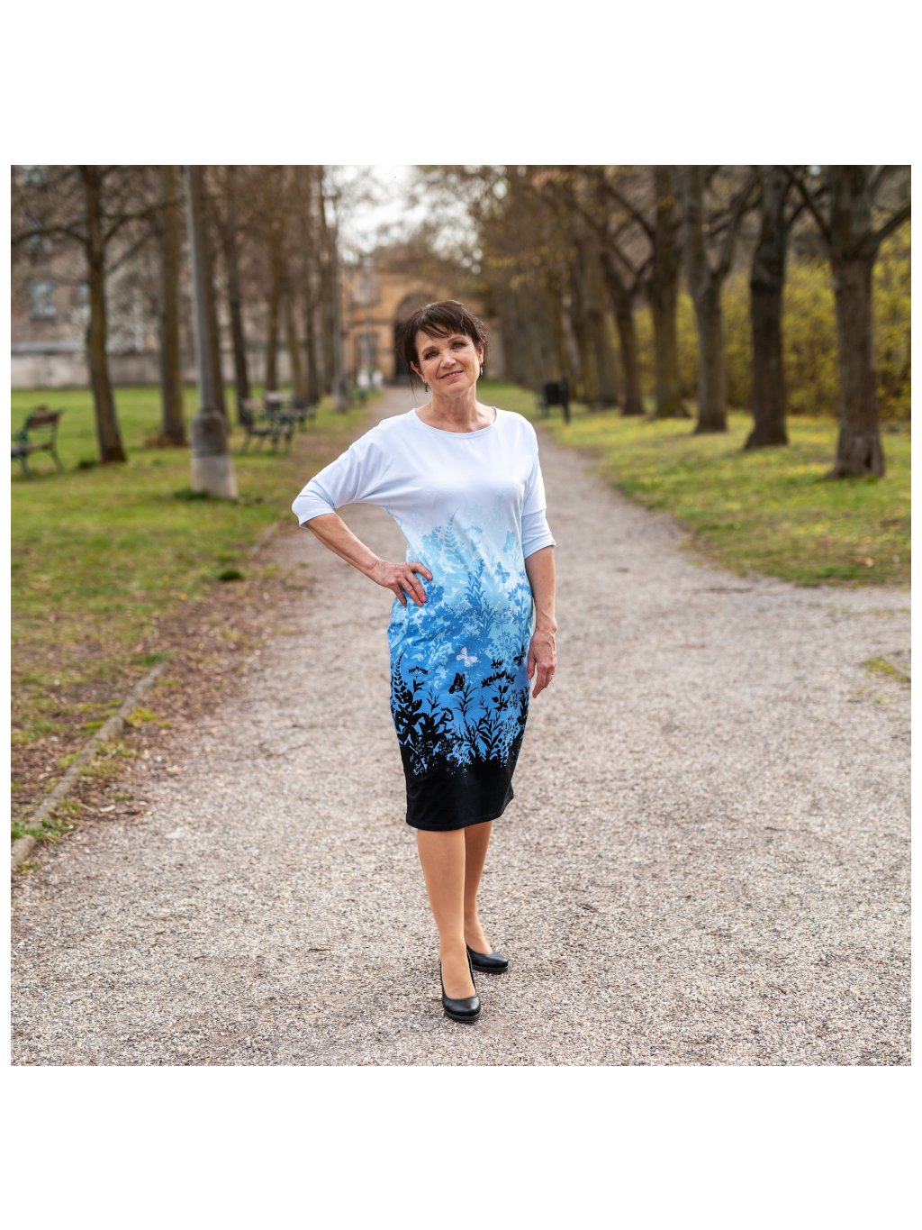 Dámské polopřiléhavé šaty ADRIANA, 3/4 rukávy, kapsy, černo-modrá louka