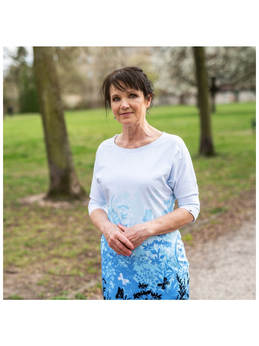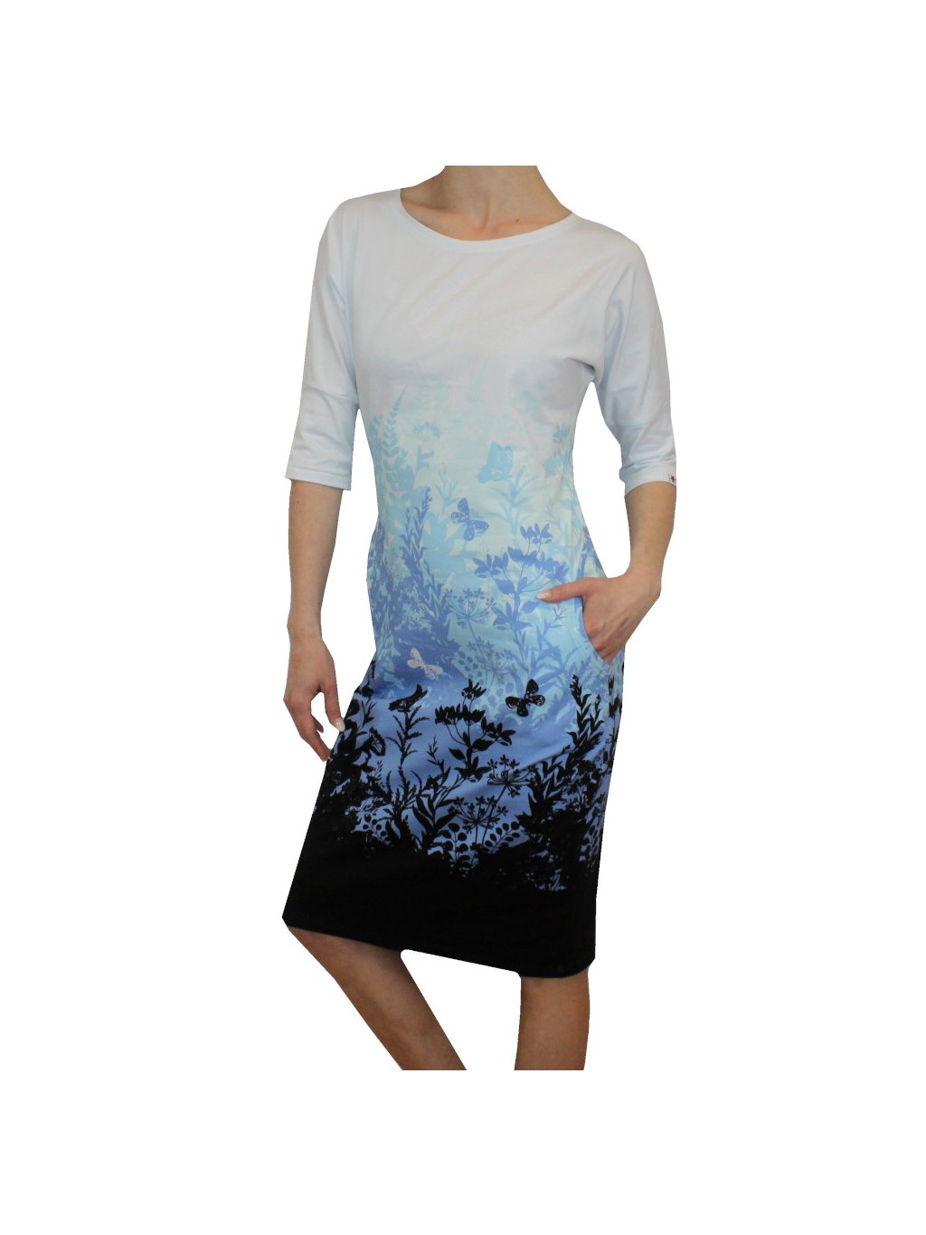 Šaty mají kulatý výstřih, 3/4 rukávy a kapsy v bocích.